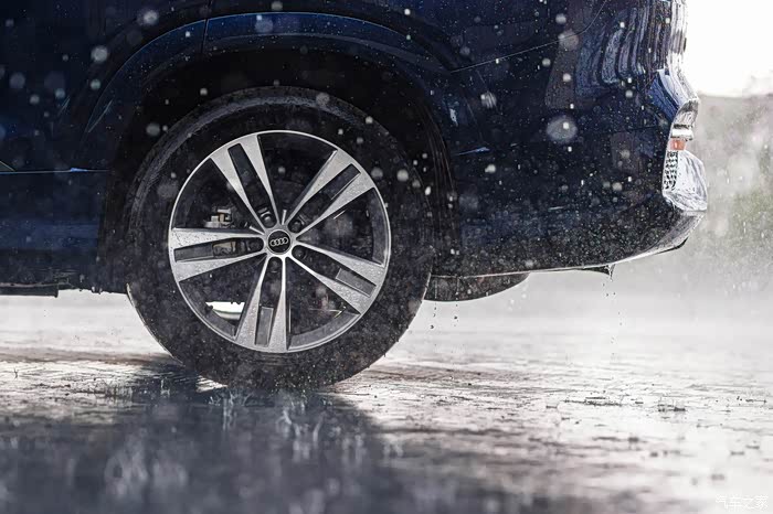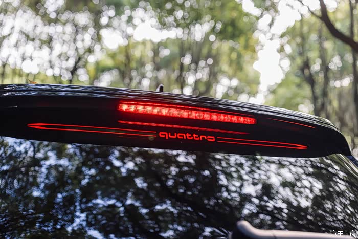 尾部的灯光设计就是和车头相呼应了,也同样是贯穿样式的,当你踩刹车的时候,在刹车灯的下方还有Quattro的投射,象征着它的四驱身份,Quattro就不用我再做介绍了,很多短视频里的那句一切交给Quattro就能彰显它的实力了,可以说是四驱系统里数一数二的水平。