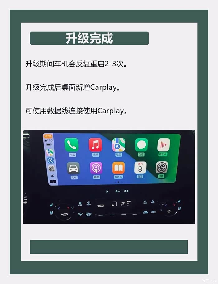 升级期间车机会反复重启 2 - 3 次。升级完成后桌面新增 Carplay,可使用数据线连接使用。