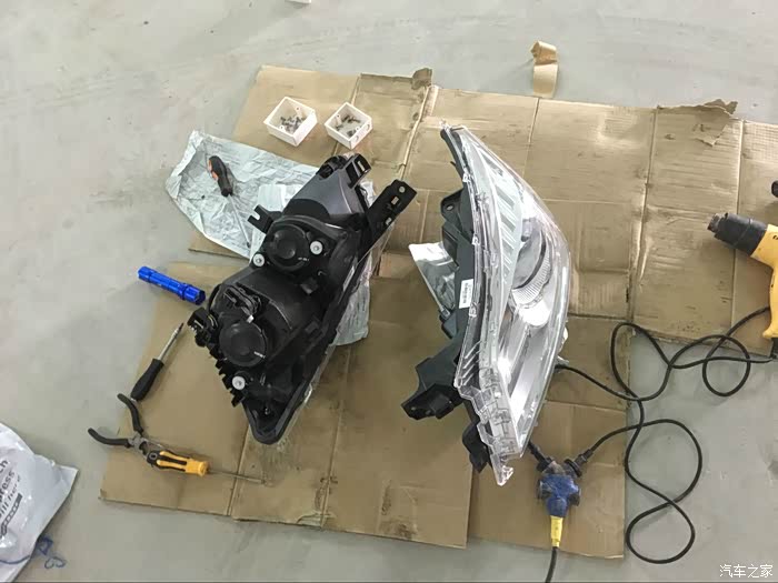 原车灯拆下,用两把热风枪几分钟就轻易打开了
