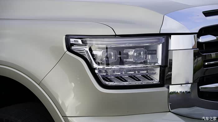 坦克500的中网采用了银色镀铬线条设计,看着质感真不错,车灯的造型也很有力量感,方圆有度的造型设计,LED光源也是标配,打开车灯,照明效果是很不错的。前大灯采用LED光源,远光灯的照亮效果比我之前想象的还要强,我感觉这车车灯的照明效果是不亚于“灯厂”。