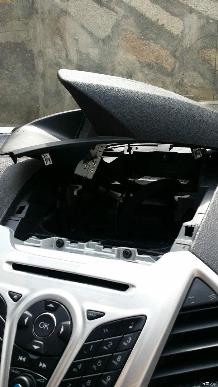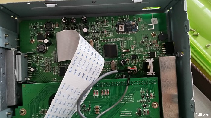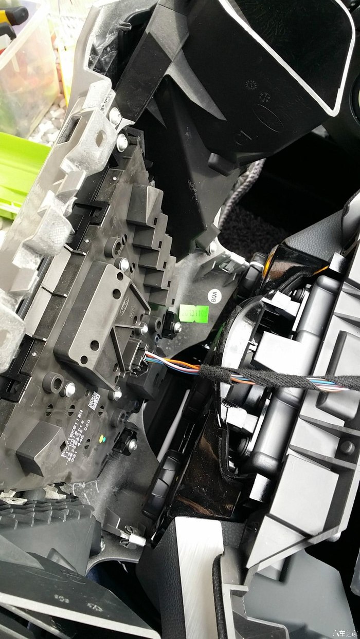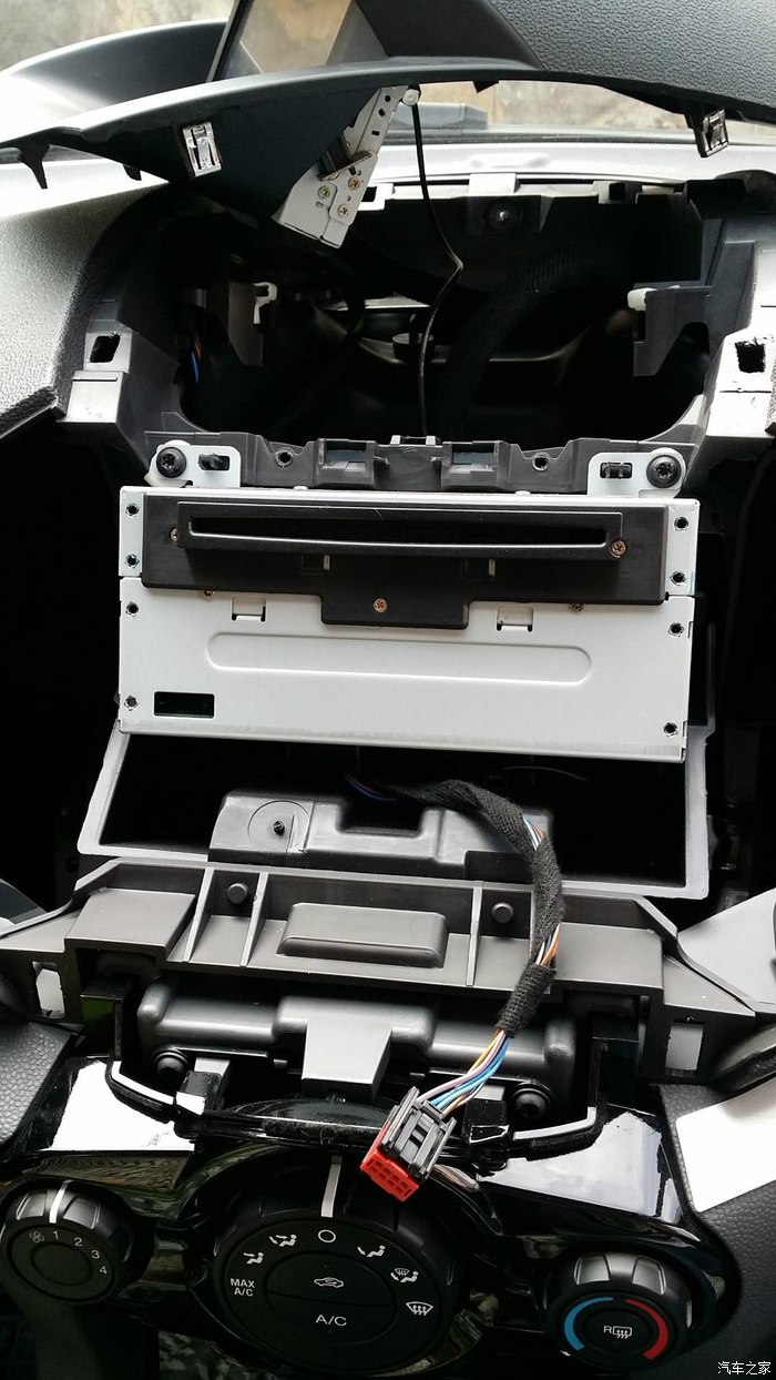 然后就是用六角梅花螺丝刀起出总控面板的螺丝,然后在用拆机棒撬开总控面板,拔出数据线,然后再起出2个主机的螺丝。拉出主机,你就可以看到主机后面的数据线,先拍照记录下来。徐港的数据线还是比较少的,很符合翼搏的机子的,不愧“原厂导航”的称号。