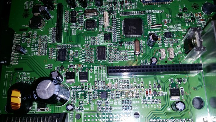 1、开始准备拆功放IC,用电烙铁配合空心针一根一根的脚一次拆下来,这个是最麻烦的,我足足折腾了1个多小时才拆好,其中有根脚还被我拆坏了。建议到电子城找修路电脑的店家,用热风机一吹,很快就可以拆下来。然后用纱布蘸酒精清理焊点,把主板擦洗干净。插上TDA7850,并一根根的焊好,第25根应当悬空不用焊接。记得焊好功放块儿后对各个焊点要补一遍锡,以防假焊。而且每根脚都不能和其他脚有相连。
