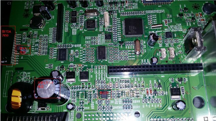 接下去转换战场,把主机拿回家里,开拆,依次拍下照片,拆机过程就不多说了。当剩下一个主板的时候,发现功放是东芝的TB2929 HQ,运放只有悲催的一颗4558,滤波电容是4700μF的,没有输出电容。将主板正反面的照片拍下来发给卖家,卖家很快就发来操作图。并说徐港也太坑了,偷工减料很严重,这样的器材音响效果肯定是很不好。看到卖家发来的处理图片,感觉和我想的一样,开始动手: