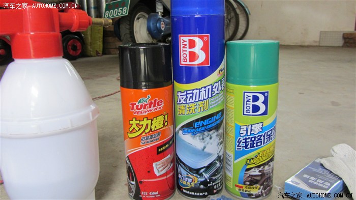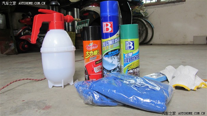 话说回来,平时我们在洗车店洗车那都是只做到了“表面处理”而车子的心脏——发动机舱我相信经常是被我们忽略了的,或者有些车主压根就没想过要给它做个清洁,那么到底为什么要清洗它呢?“长时间的油污等酸性物质会腐蚀发动机舱内的各个部件,如塑料套的线路。胶套损坏后易造成短路或故障,也影响发动机舱的美观和车况。如果您驾驶的是新车 新车也需要定期的底盘和发动机清洗护理,以保证车况依然如新,倍加保值。 如果您驾驶的是5成新以上的车旧车更需要定期的清洗护理,降低汽车自燃概率,改善车况,再次体验开新车的感觉。”——这段话是引自百度的,但事实还就是这样,所以就有了这篇帖子,可能有些朋友就想了,会不会得不偿失把发动机弄坏了呢?不用担心,发动机舱没有你们想象的那么脆弱!只要多加注意该启动来清洗时就启动该熄火时也不含糊就没事的。以前我也不敢,但在以前看过之家有那么一篇清洁发动机舱的帖子后我就决定也自己动手了,那么清洗它到底需要什么物品和几个步骤呢,下面上图: