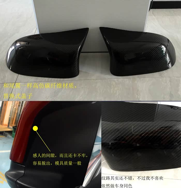 4、仿m蝙蝠耳(质量不如意,缝隙不小,卡扣也不是很牢,而且线条讲真的挺一般,跟原产没法比,但是原厂实在价格感人,因为要换整个后视镜总成,没五位数下不来)