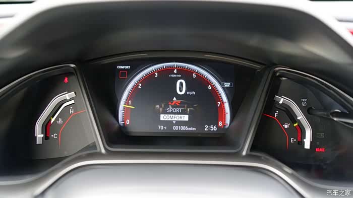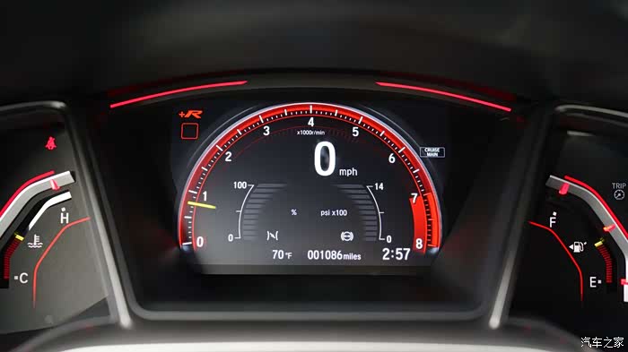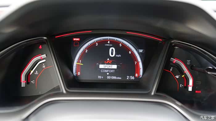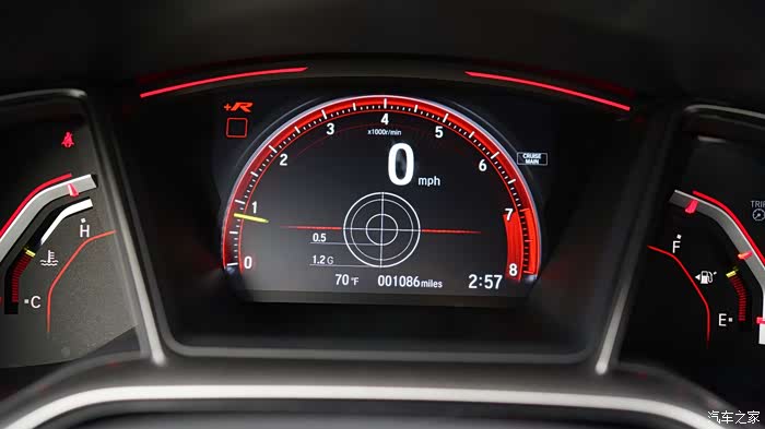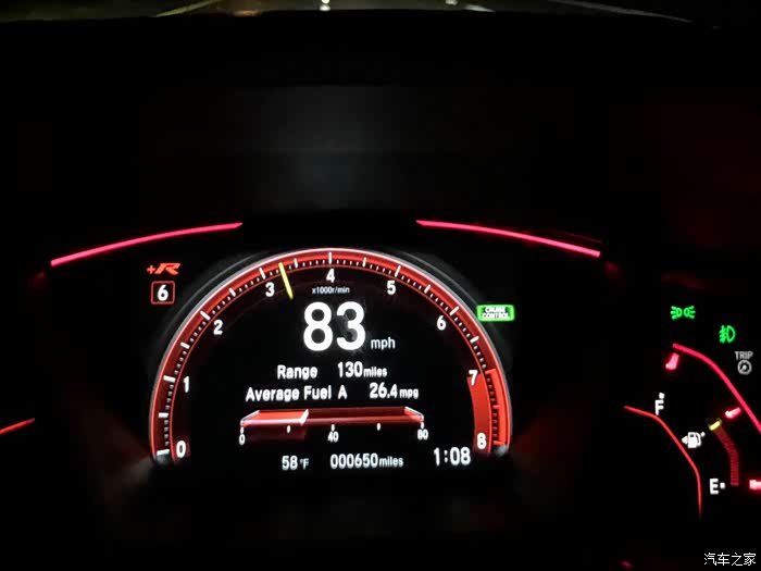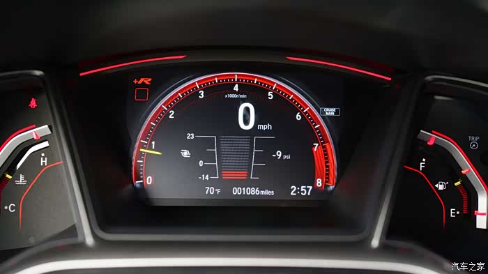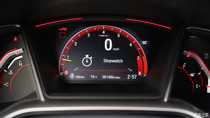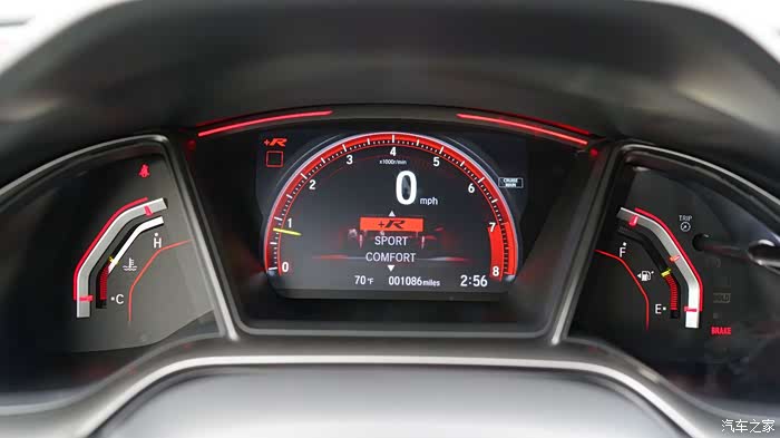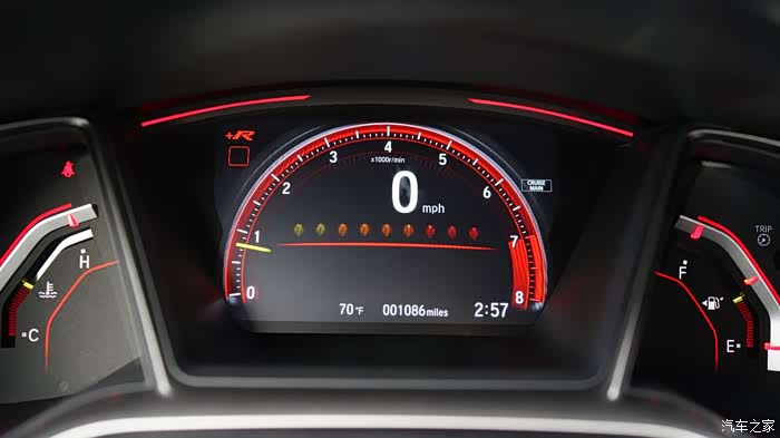 仪表盘的造型呢也是在运动版思域的基础上少做了点改变,指针全部变黄色了。 同时普通思域表顶上原本用于显示当前省油指数的绿色调调也换成了纯红色,在+R模式下变为呼吸灯模式来和换挡提示器协调工作。(快到换挡的时候会闪)