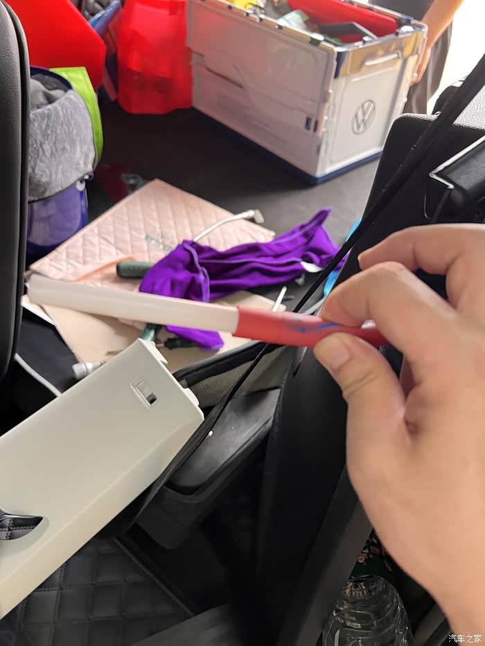 开始处理右侧。右侧不同于左侧,它是斜插在车身的,灰尘会随着水流下来沉积在这里,淤堵导致它会脱落造成第二排右侧脚下的储物盒里有水。