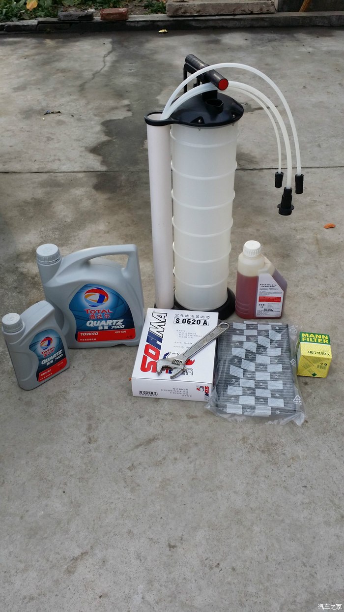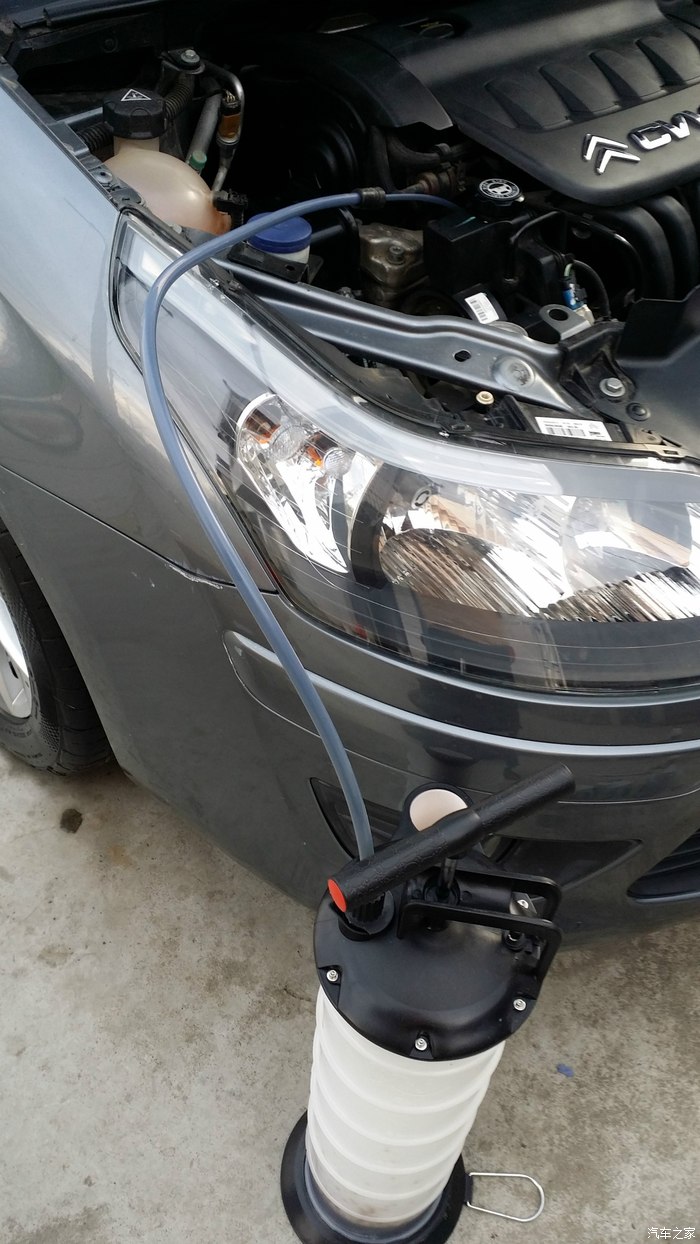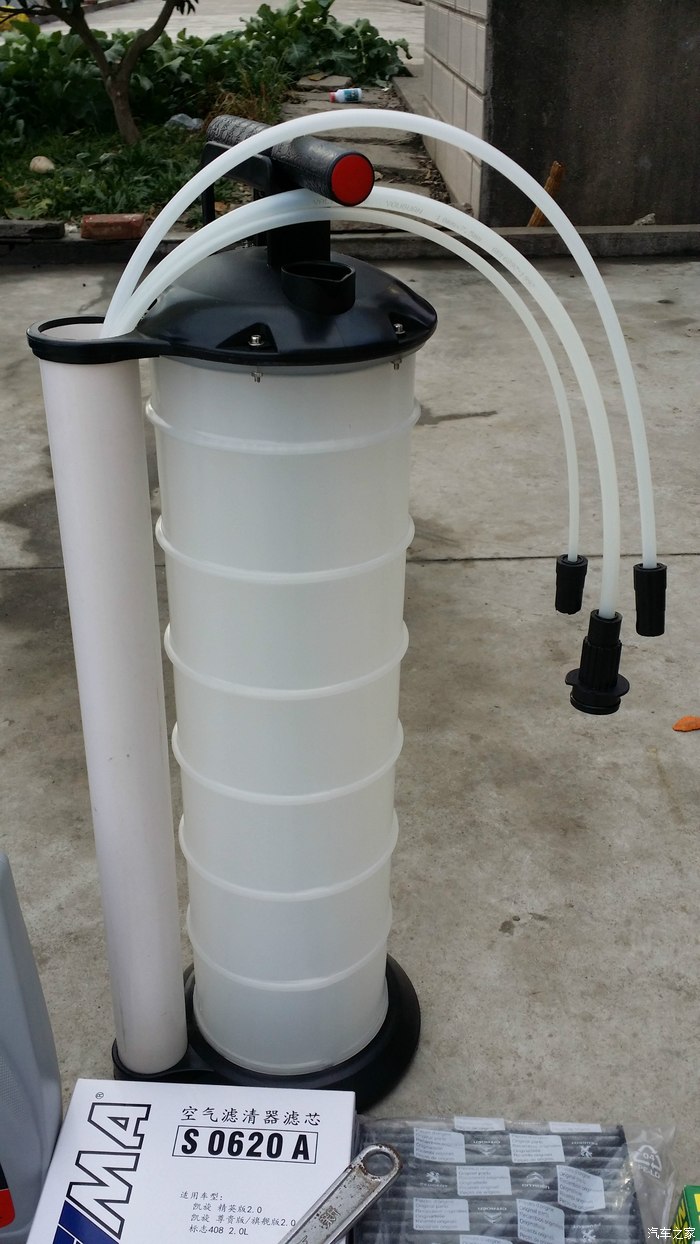 然后,像打气筒一样,上下抽动5-6下,就能看到黑油从管子里出来,感觉到抽油桶里气压不足继续按照以上步骤重复操作,大约过15分钟就能抽干净,我的抽出来大约4.5L,和在4s保养抽出来的量差不多!