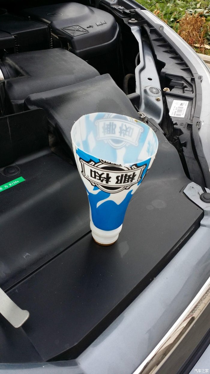 新机滤装上后,开始从加机油口的地方倒机油了,自制漏斗,嘿嘿,勿笑哦!