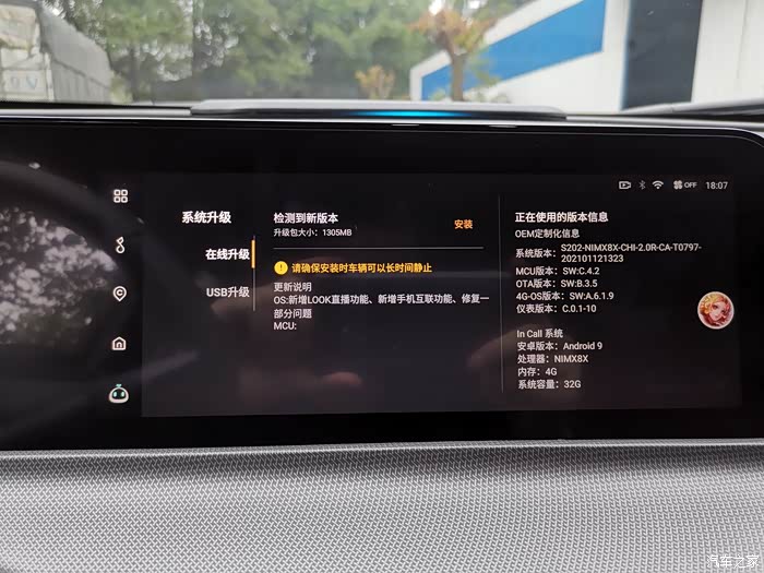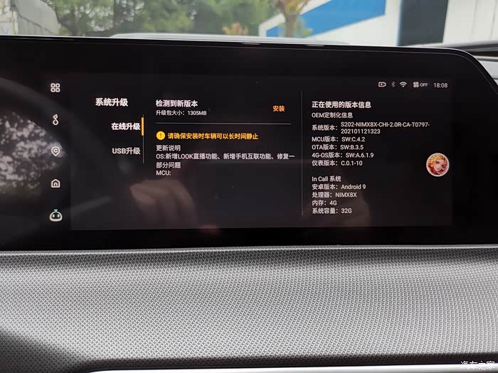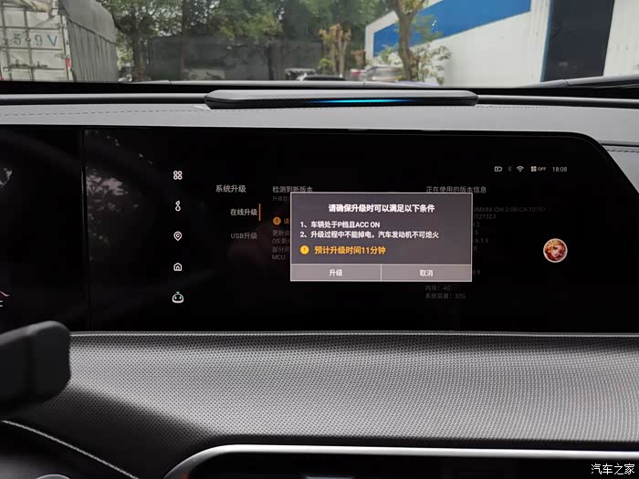 今天在驾驶unit 去公司的路上,突然中控屏弹出来一个消息框,由于在开车我也没仔细看,到达目的地的时候,我才发现,原来是系统需要升级了,而且升级包是非常的大,1.3个g,下面还有更新的内容等等。我们的unit拥有ota空中下载技术,我想肯定好多小伙伴不知道这是什么东西,其实简单来说,他就是一个在线系统升级程序,它重点解决了一个空间距离的问题,因为以前升级系统动手能力差的到四s店,动手能力强的就准备U盘,在电脑上下载升级程序,然后插到车载USB接口上进行升级。但是现在我们不再需要把车开到4S店,在任何一个有网络的地方就可以解决部分问题。所以现在我只需要点一下OK,然后根据提示一步一步点确定就行了。如果弹出的升级界面不在了,我们可以找到中控屏上的系统升级图标,也是一样可以更新到最新的中控系统。在升级的时候一定要注意车机是不能断电的,需要用到几分钟时间,所以最好在不用车的时候再进行操作。下面跟大家图片分享一下我的升级过程。