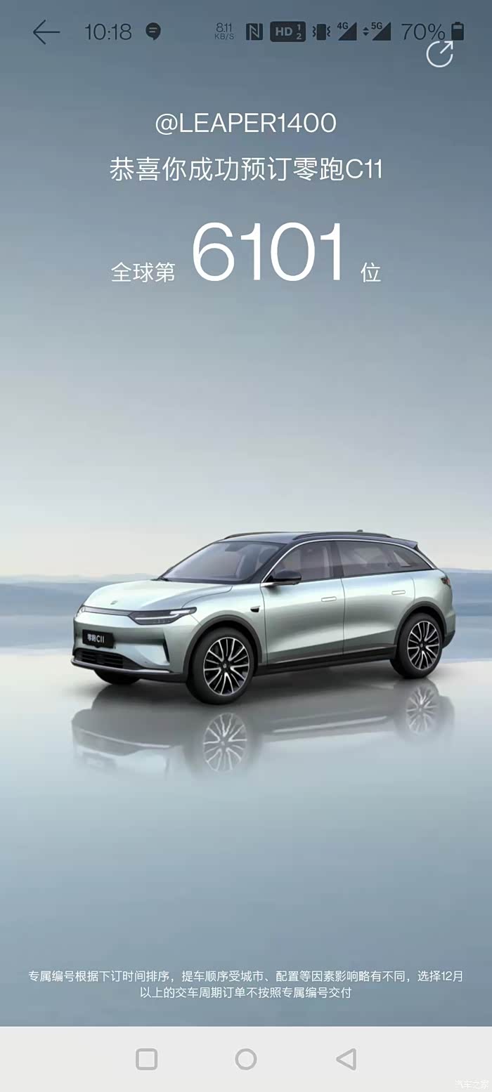 意外发现零跑C11这个车之后,我就开始在网上各种找视频、文章、论坛找相关资料了解,越来越觉得这车是我喜欢的那个ta,于是开始各种找微信群,进群聆听群友们的经验及订车感受。(特别后悔当时没交定金,预留单子)由于大连当地及无销售店,也没有实车交付,当时就没敢下单。期间经常听群里人说收个老订单什么的,我也没在意。再怎么也是小20万的东西,我连实车都没见过,怎么可能直接下单。订车这件事儿就又拖了一个多月。十月初开始交付之后,群里陆陆续续就有人提车,开始分享照片视频,看完真实车主的分享,购车的欲望就愈发强烈。