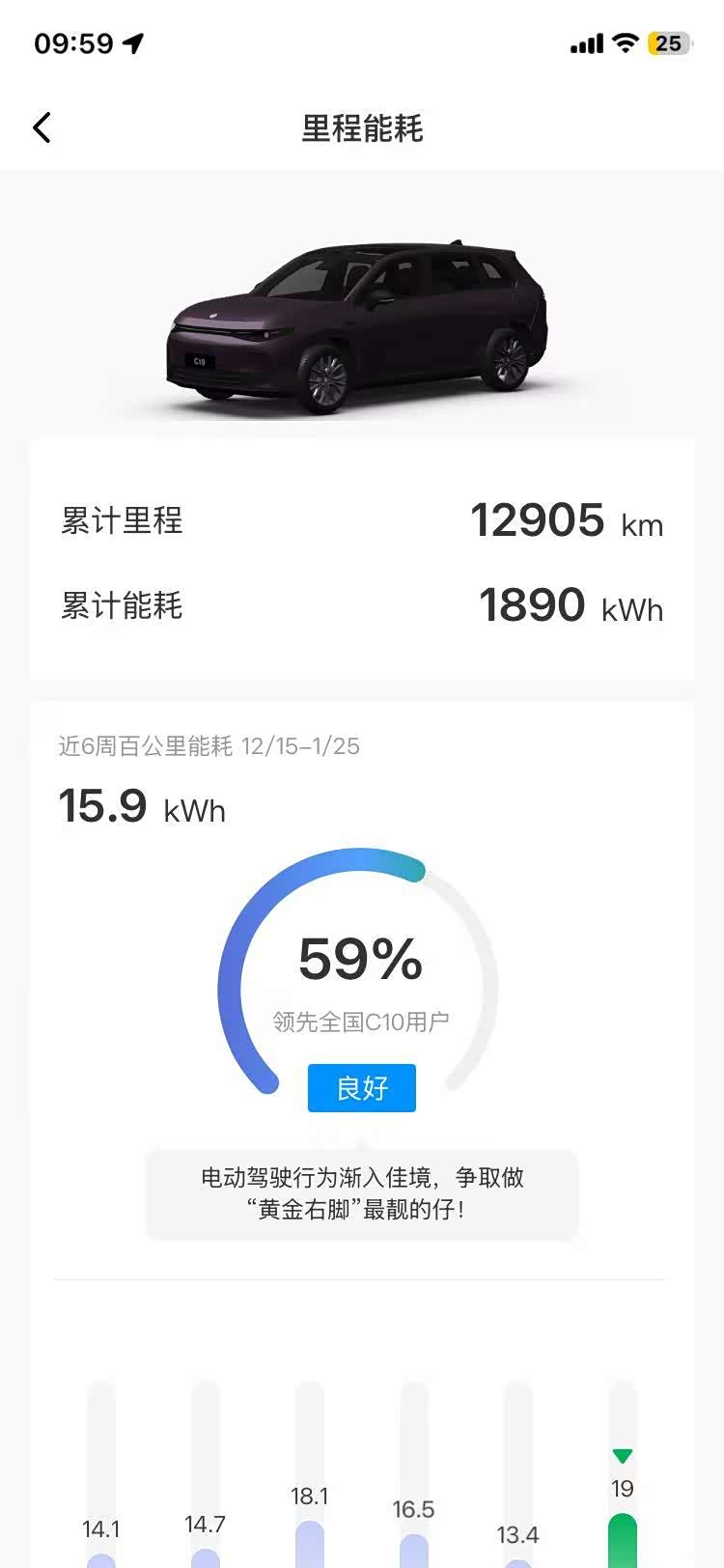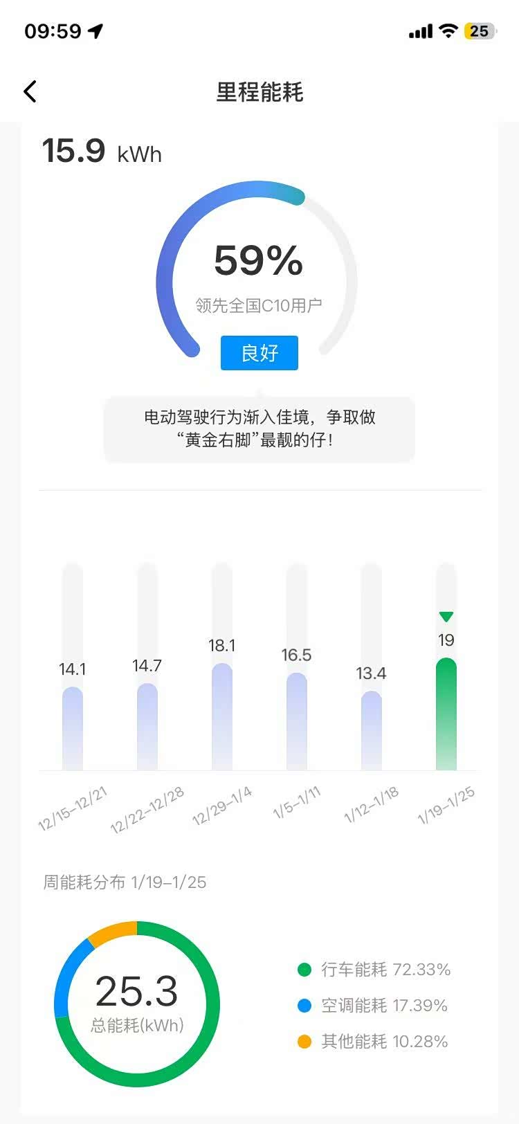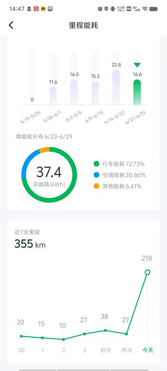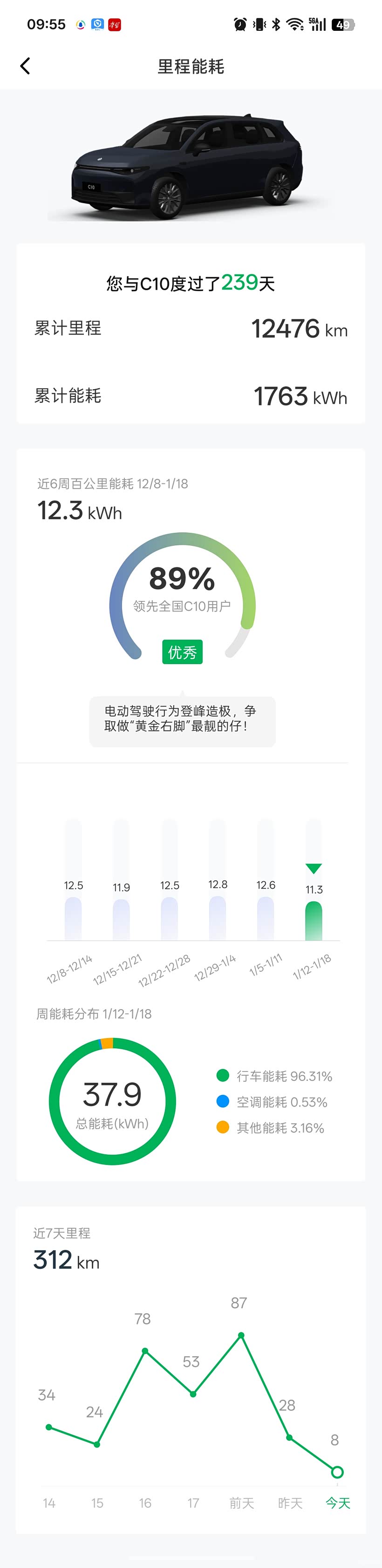 3、能耗整体不错,没有续航焦虑。虽是正力电池,但能耗还是可以的。能耗跟天气有关,浙江最近6周,天气基本都是晴天,气温也比较高,所以,基本上没怎么开空调,平均能耗保持在百公里12.3kwh,充满电动态续航可以达到590公里,充一次电一般跑400-480公里。夏天能耗要高点,大概在百公里16kwh以上,有时候超过20kwh。当然能耗跟个人驾驶习惯也有很大关系,车辆一般设置驾驶模式为舒适模式,动能回收设置中或强,平时开车比较平稳,没有急加速急减速,提前预判红绿灯,过不了提前减速,增加动能回收,基本上很少用急刹。