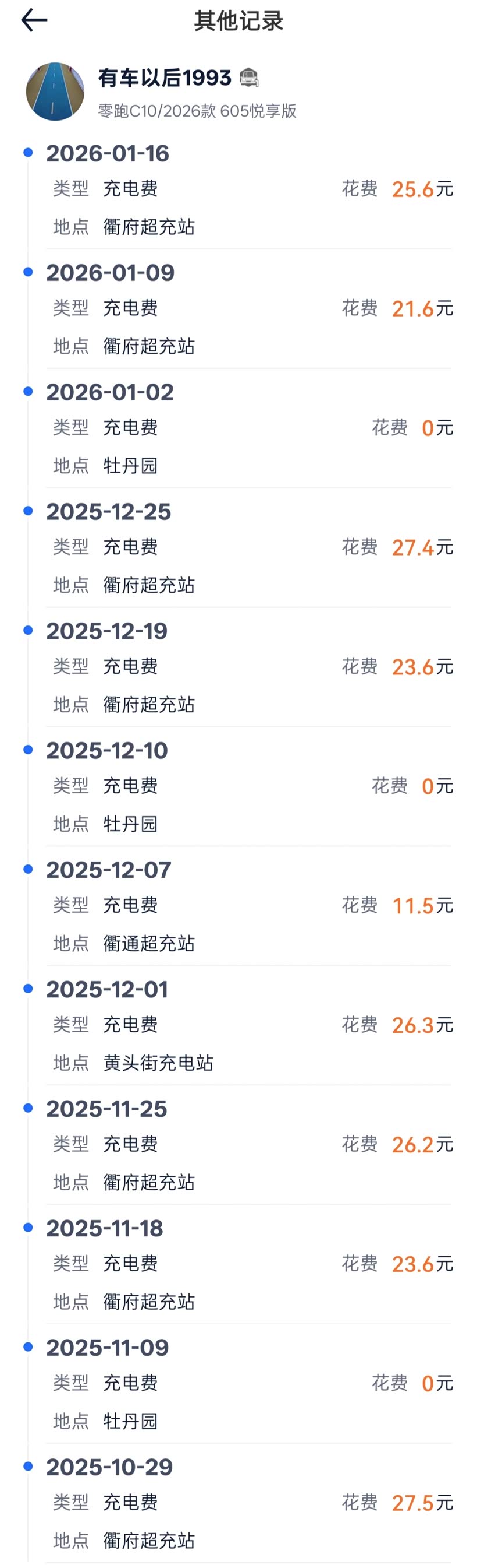 2、充电比较方便。没有车位,所以没有安装家充,4S店赠送的充电桩还没拿过来,一年之内免费安装。做了下衢州本地的充电攻略,国网安装的充电 桩(E充电)都比较贵,基本上不去用,除非跑长途,没办法在高速服务区充电。城区基本上用的“星星充电”的充电桩,最便宜的充电站位于衢州水亭门的衢府超充站(在市中心),谷电电价0.45元一度电,充电时段是中午11:00-13:00,晚上22:30-次日8:00。其他衢通集团信安超充站(离我家比较近),谷电0.5元一度;黄头街新村充电站(就在单位附近),谷电0.55元一度,充电时段也是中午11:00-13:00,晚上22:30-次日8:00。虽然没有家充,但充电也很方便,每个月基本上充3-4次。从10月份开始记录充电费用,有几次是免费充电。