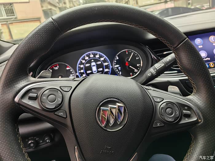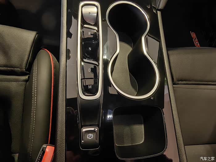 GS的内饰和普通君威的内饰还是有一定的区别,手能摸到的地方基本上都是软皮的,座椅,仪表台,车门内饰板全黑内饰搭配红色的缝线看着很运动。运动座椅的包裹性特别好在靠背上还有专属的GS标识,换挡采用了最新的按键式设计节省了很多的储物空间出来,内饰用料还是比较良心的简单大方!