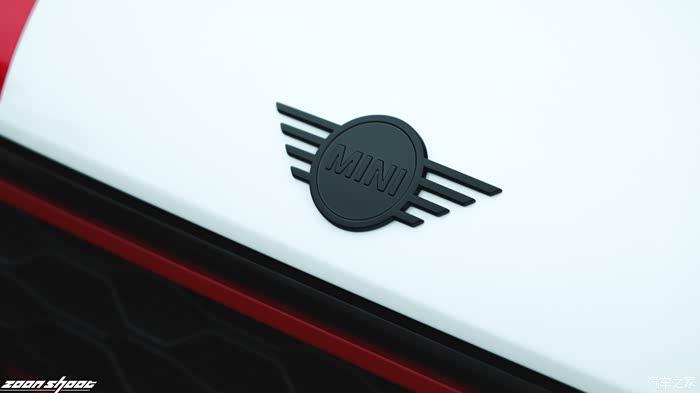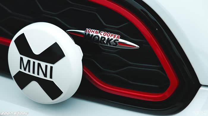 熏黑的MINI车标在白色的引擎盖上显得低调又不凡,很好地为引擎盖做了点缀,同时又与黑色的进气格栅形成呼应,可谓整个前脸造型的点睛之笔。