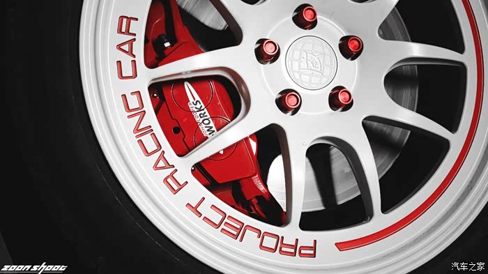这款夺人眼球的白色轮毂来自“深夜永久”的定制款式。经过沟通,车主将自己的赛事“Project Racing Car”镌刻在了轮毂上,红白配色和车身的整体颜色搭配相得益彰。内藏的JOHN COOPER WORKS 制动卡钳在不经意间诉说着自己的不凡,它在原厂状态下可以把这台“大家伙”在37.8M内从100km/h刹停,可以说是令人满意的成绩了。