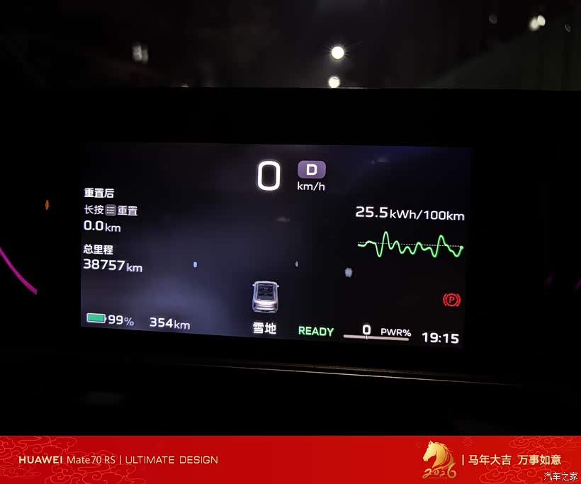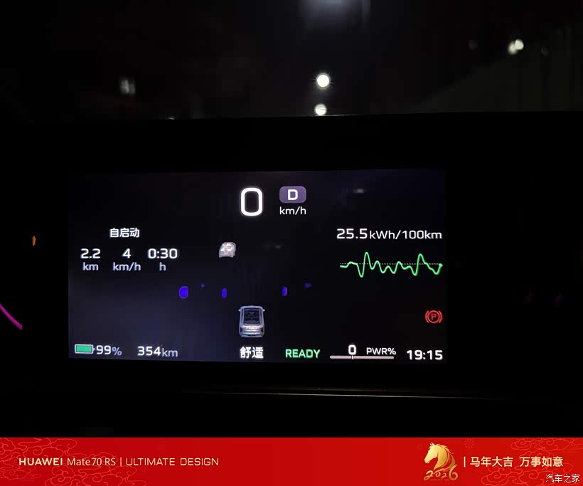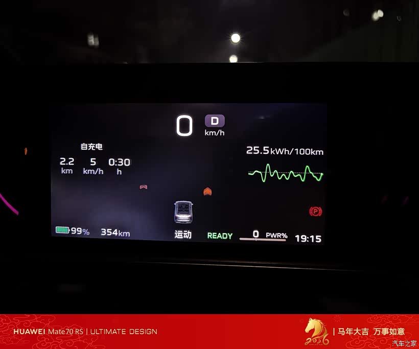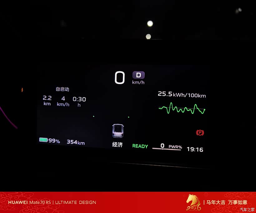 无论哪种模式,25.5kWh/100km的能耗曲线、99%电量与354km续航里程等核心信息都持续清晰展示,配合“READY”就绪状态的绿色提示,让驾驶状态一目了然,既体现了红旗EH7的科技感,也兼顾了不同场景下的实用性。