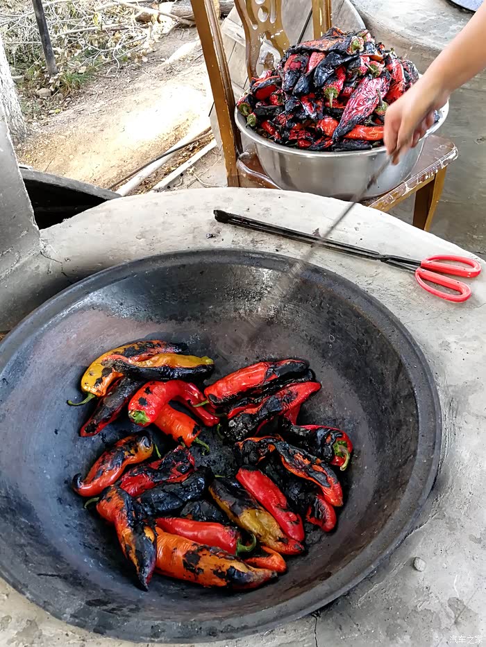 现场有烧辣子和锡伯大饼的制作演示。辣椒表皮烤软后撕去焦糊的表皮后,与其他青菜拌一起配合锡伯大饼食用