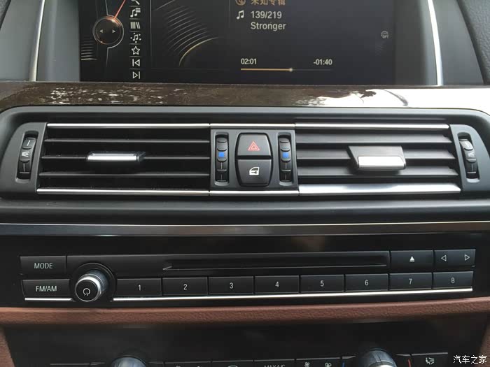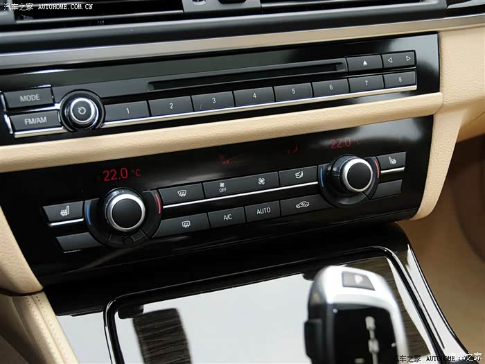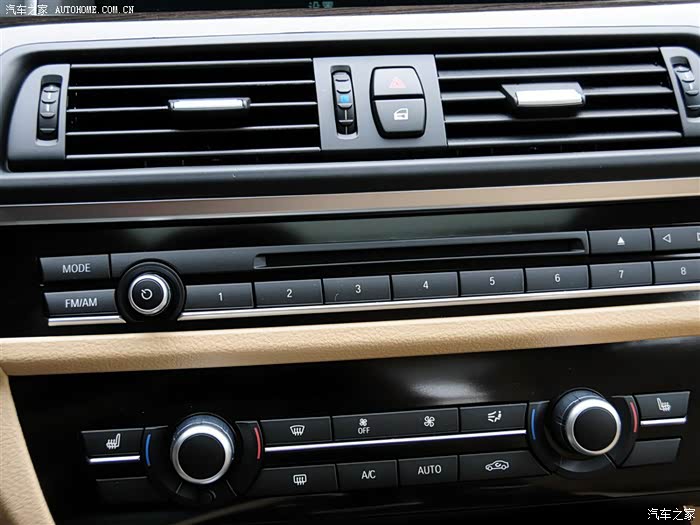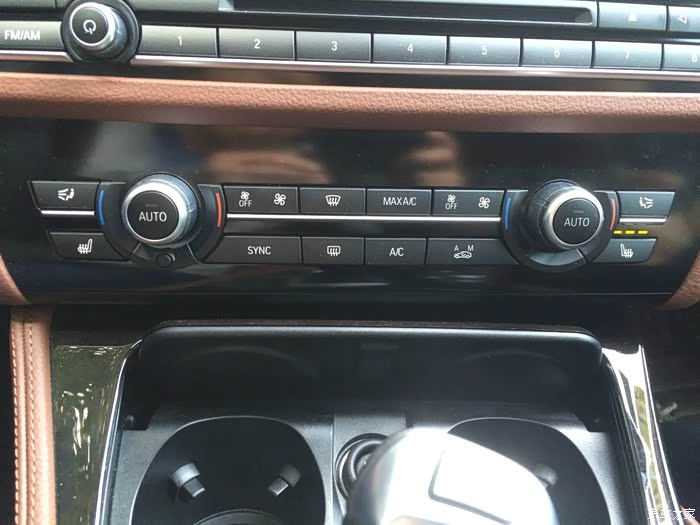 此处可以看出按键布局的不同,528LI领先前排2区空调多了AUTO(自动调节功能),MAX最大冷热风量功能,A/M是空调自动检测有害物质关闭功能,SYNC前排控制后排空调功能。