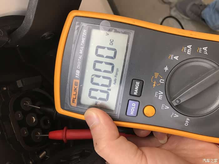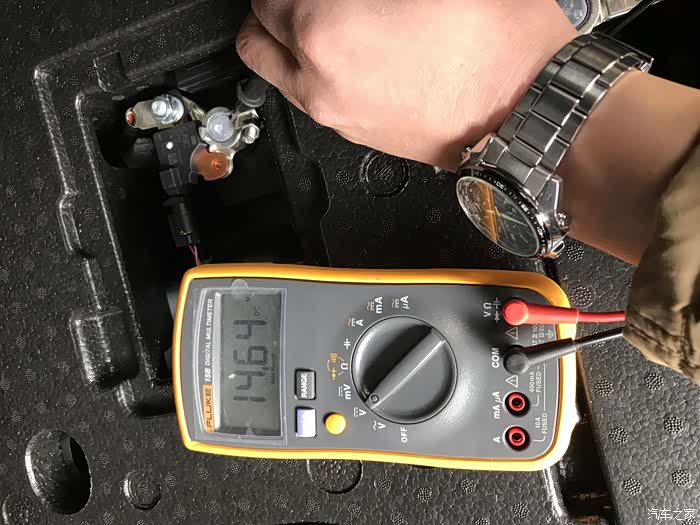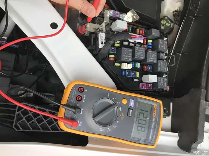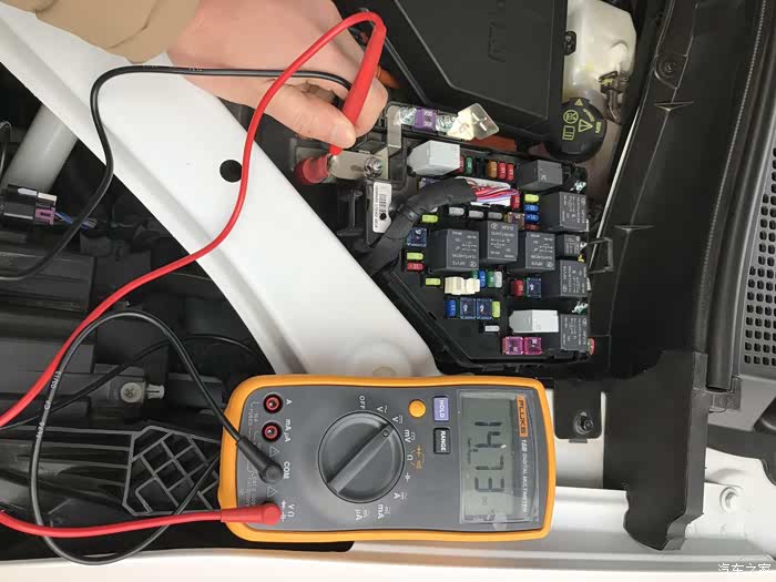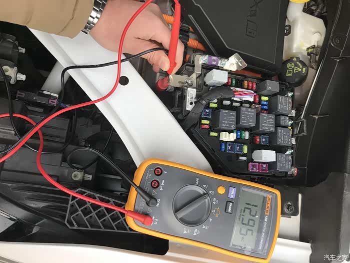 eRX5的小电瓶与传统能源汽车的位置不一样,它位于后备厢隔板下,在车辆的右后侧,然后通过电缆线将正极引至前机舱,负极接车架,前机舱保险座上正极铁片等同于蓄电池正极,测试电压测量点取前机舱保险座正极铁片,负极取EDU变速箱外壳。测试过程如下:
