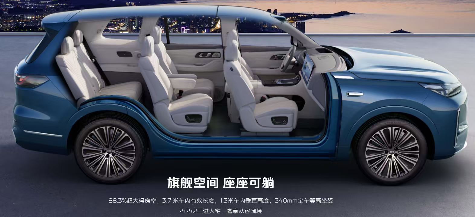 车身长5205mm、宽1999mm、高1800mm,轴距超3米(3030mm),采用2+2+2六座布局,得房率达88.3%,实现“三排平权”设计,不再有第三排坐小板凳的感觉。符合国人一贯追求的大空间、大尺寸,也能提供更加宽敞舒适的乘坐体验。