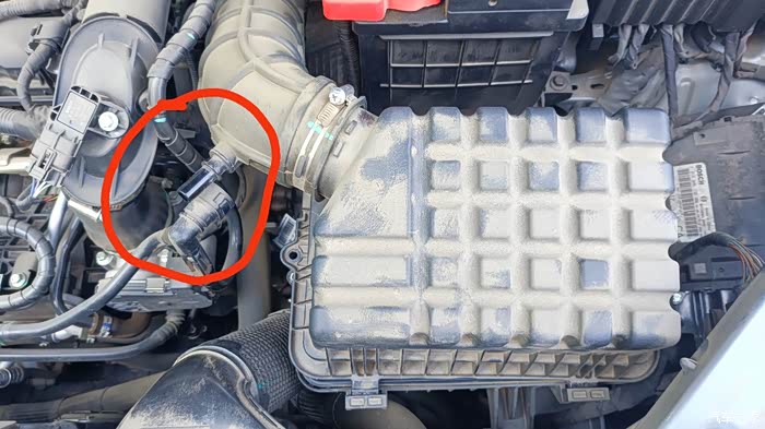 这个一定要拔掉,否则空滤盒子根本打不开。图中画圈的是个硬管。拔掉就可以打开空滤盒子了。