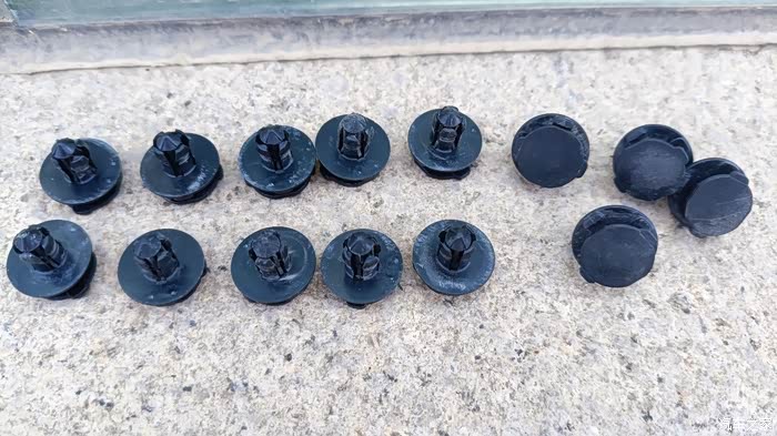 看来只能拆开这个护板了,数了一下,一共16个这样的卡扣。这卡扣的样子很奇特,之前没见过。研究了一番,发现拆好了可以循环使用。