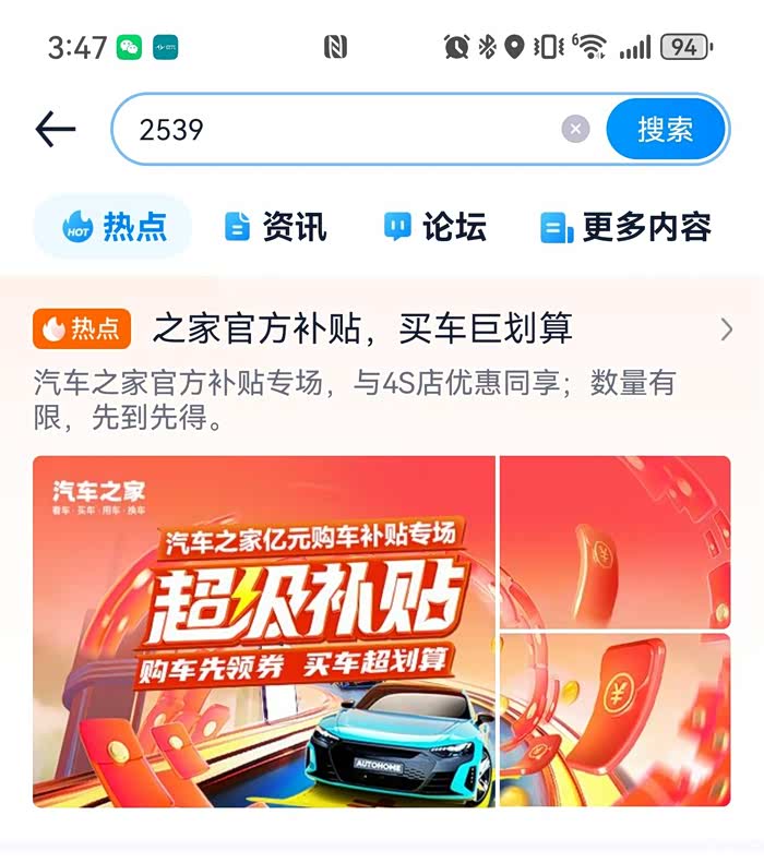 二是打开汽车之家App,搜索“2539”,点击超级补贴活动进入,输入想要购买的车型,点击领取。