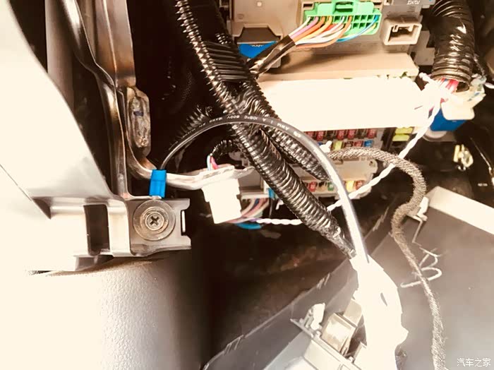 电源有了,下一步是接地。这个比较麻烦,得找一个搭铁点。我选了图上这个螺丝搭铁,松开螺丝插上地线拧紧螺丝,启动车辆,行车记录仪电源指示灯点亮,搞定!