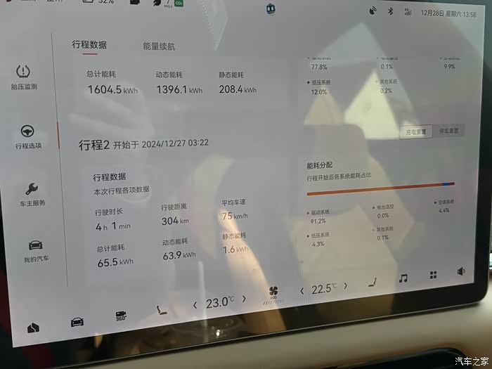 12月总计行驶1644km,驱动能耗为19.8kwh/100km,总能耗在22.9kwh/100km,其中600km高速、400km高架、其余为短途通勤;
