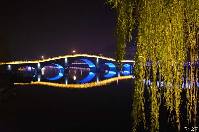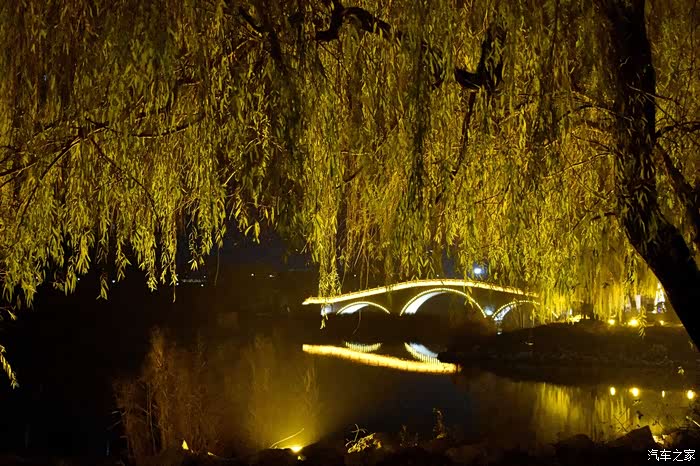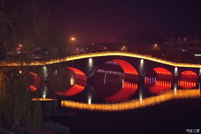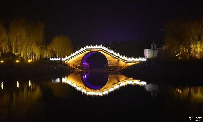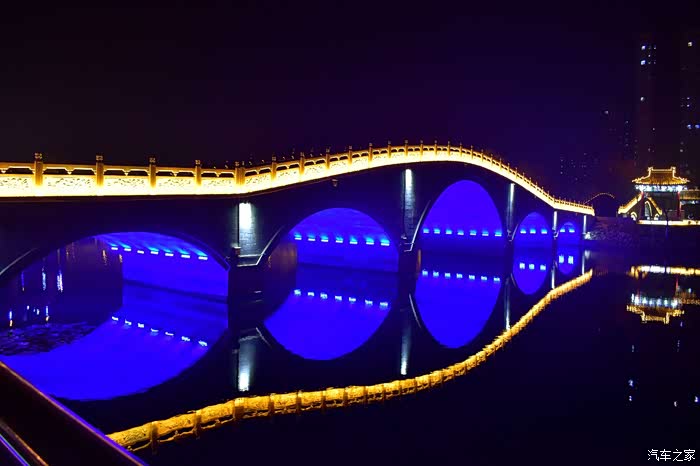 但在这夜色里,安装了霓虹灯的湖上的拱桥又是一番奇妙的景光,五颜六色,流光益彩,半圆的拱桥和水中的倒影交相映辉,像一个一个伫立在水中的彩色光环,镜花水月,美的耀眼……