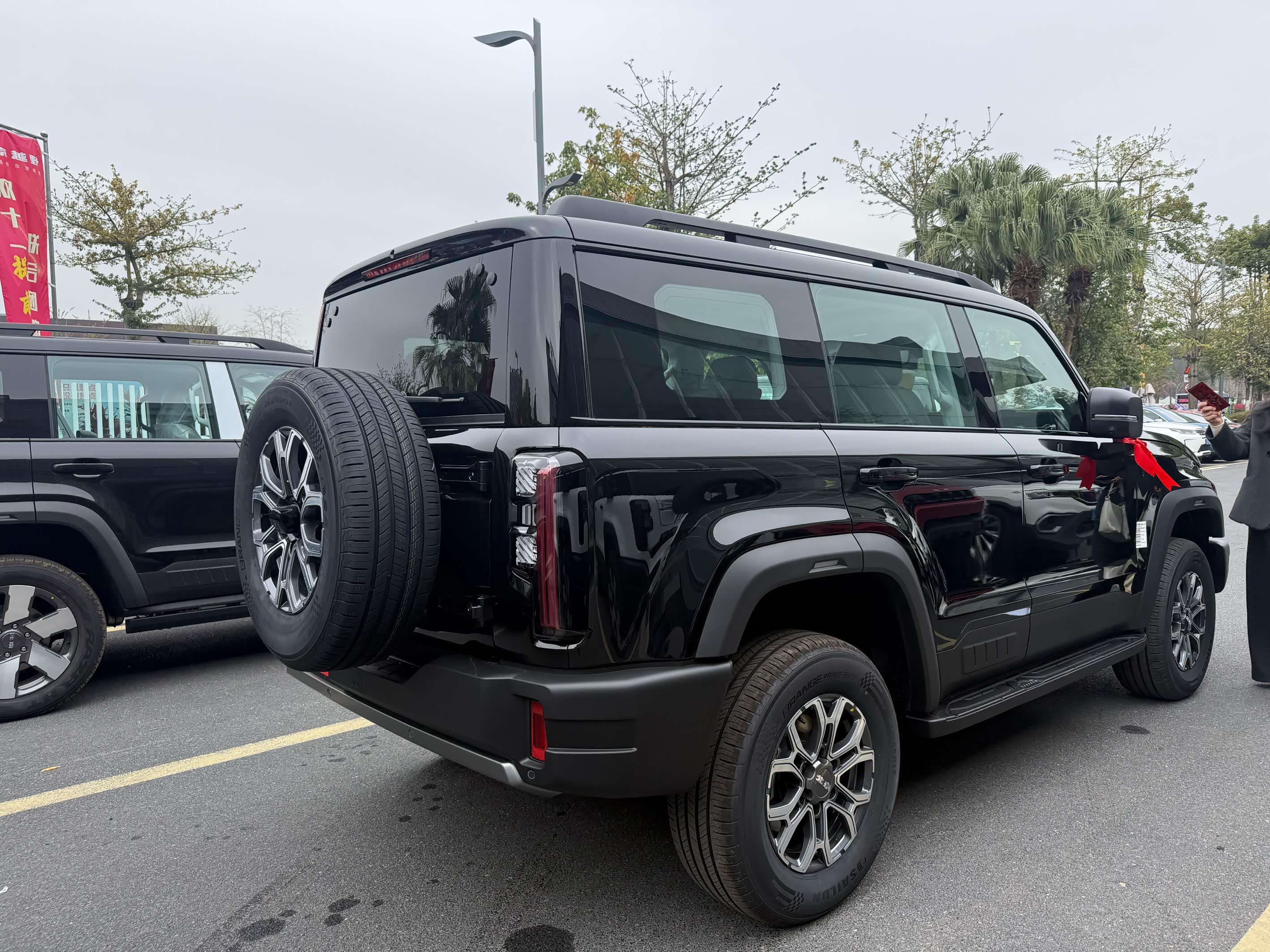 ? 经典方盒子造型得以保留,但细节全面升级:熏黑五孔格栅加宽加厚,搭配脉冲式LED日行灯,白天是低调硬核的“黑武士”,晚上点亮后灯光呈环形包裹格栅,辨识度拉满,不浮夸但自带气场。18英寸熏黑越野轮毂+黑色宽体轮眉,搭配AT全地形胎,视觉上扎实不飘,背挂式全尺寸备胎+侧开尾门,保留了硬派越野的精髓,装卸露营装备比上掀式尾门方便太多。