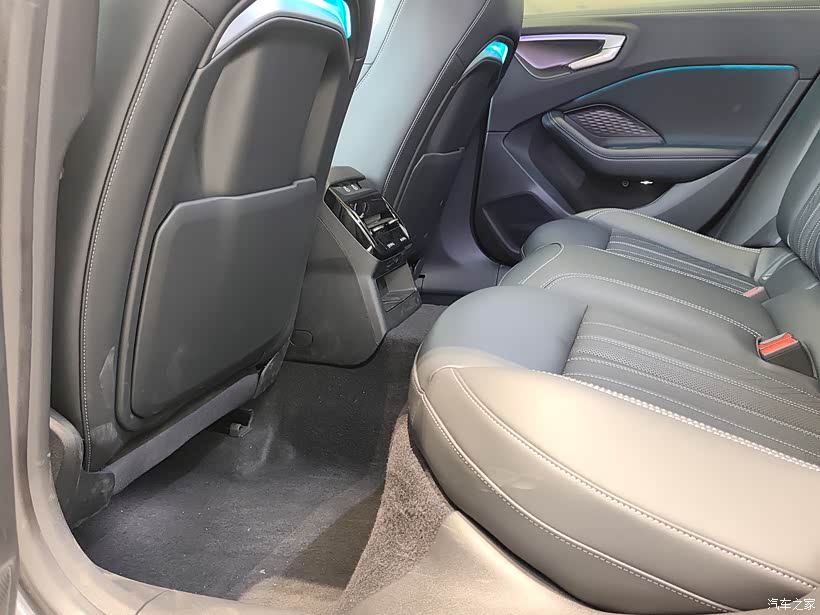 后排空间比预想的好,一米七六的朋友坐进去腿部有两拳半余量,但溜背设计导致头部压抑,头发长点会碰到车顶,中间地台凸起很高,后排坐三人的话,中间乘客会很不舒服,更适合两人乘坐。