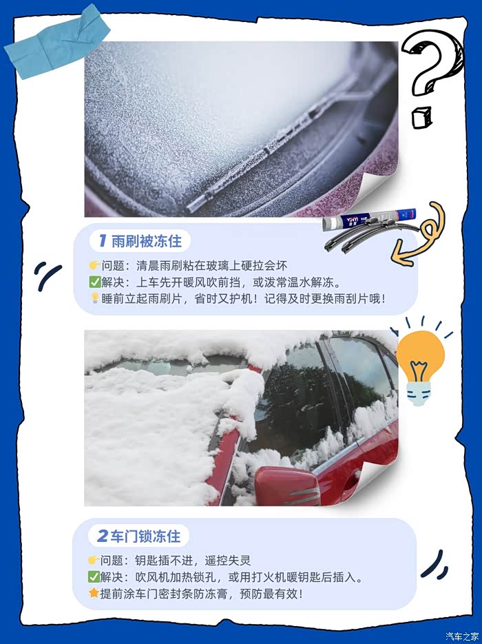 解决:上车先开暖风吹前挡,或泼常温水解冻。