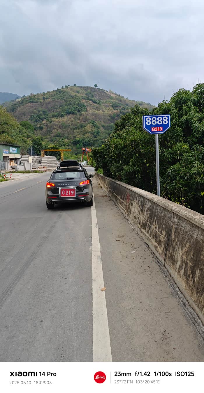 5/11第九天:***县-绿春县。今天天晴,山坳里的***县城很平静。副驾喜欢逛农贸市场,酒店早餐后先去逛一下。然后前往金水河口岸打卡,听说口岸有边贸市场,实际当天没有。直接导航前往绿春,导航根本不显示g219,地图上打点后可以走,但不到180公里,需要6-7个小时。路况比较差,弯多弯急路小,很多炮弹坑路段。一段砖铺路对行车也不友好,何况年久失修。下午6点安全到达没有红绿灯的县城---绿春
