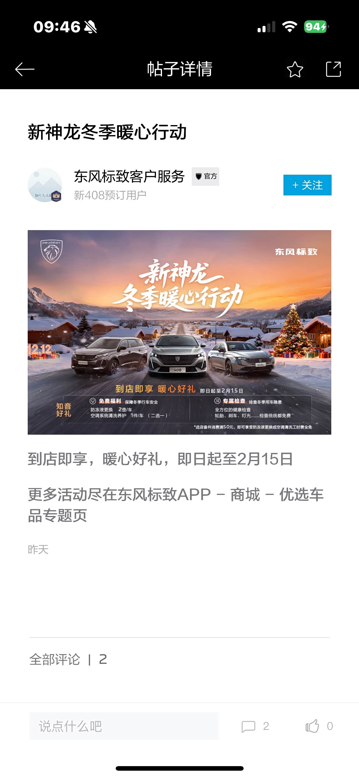你会不会时不时的在APP看各种活动呢,我经常看,好多活动优惠都是第一时间从这里得到的,12月1日起所有神龙客户进店都可以享受的免费福利哦-两壶防冻液或者空调系统清洗2选1,一车享受一次,冬天嘛我首选是防冻液,厂家暖心活动赠送的2桶,我自己在买一桶,工时费只要在店里消费满50元以上就可以免工时费的,这个活动真的很给力的,切切实实的免费两桶,如果你之前刚换过也可以把两桶带走也行,真正的无套路,大家没领的的赶紧去噢,我已经拿到手啦,果然换新领导就有大动作,发动机终身质保在到冬季暖心活动,更加扎实了客户的心。