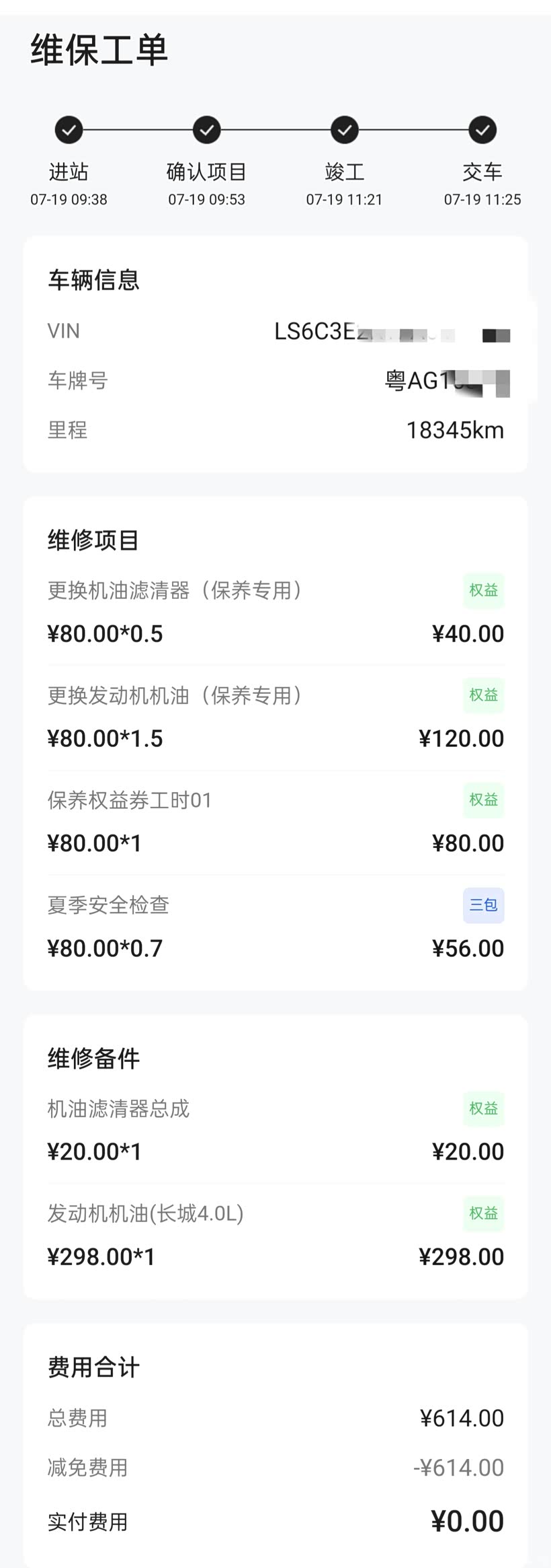 高速费主要是节假日回老家和自驾用的,今年跑了四次长途,高速费总共840元(扣去节假日免高速费),平均下来每次两百多,中短途高速费288元,这个花销看个人出行频率,不算固定支出。然后是保养费,深蓝的保养政策还算友好,购车时赠送了6年12次保养,今年去做过两次保养,换了机油、机滤,还有常规的全车检测,没有强制推销额外项目,这点很加分,所以保养这块没花过钱。