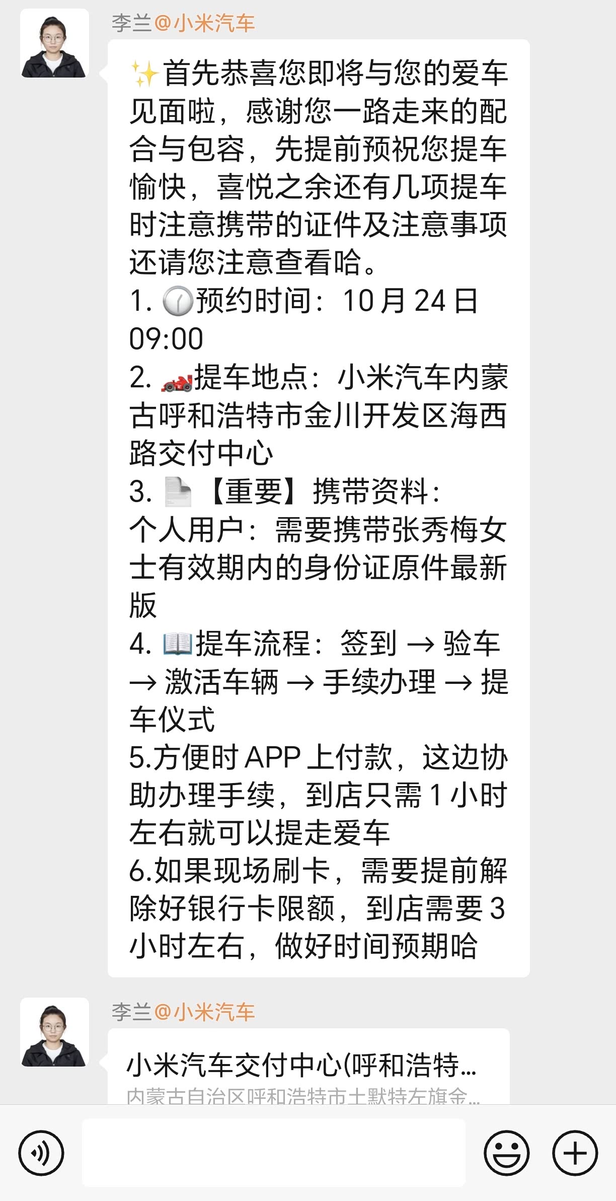提车当日,其实如果交清尾款之后,当日提车还是很快的,他会提前开好发票,流程比较简洁。检查车辆外观之后,办理保险,买小米无忧包,缴纳购置税,办理临牌,工作人员会帮打卡合照,就可以开着新车gogogo啦!