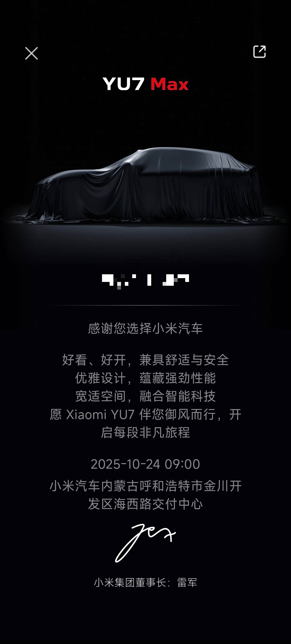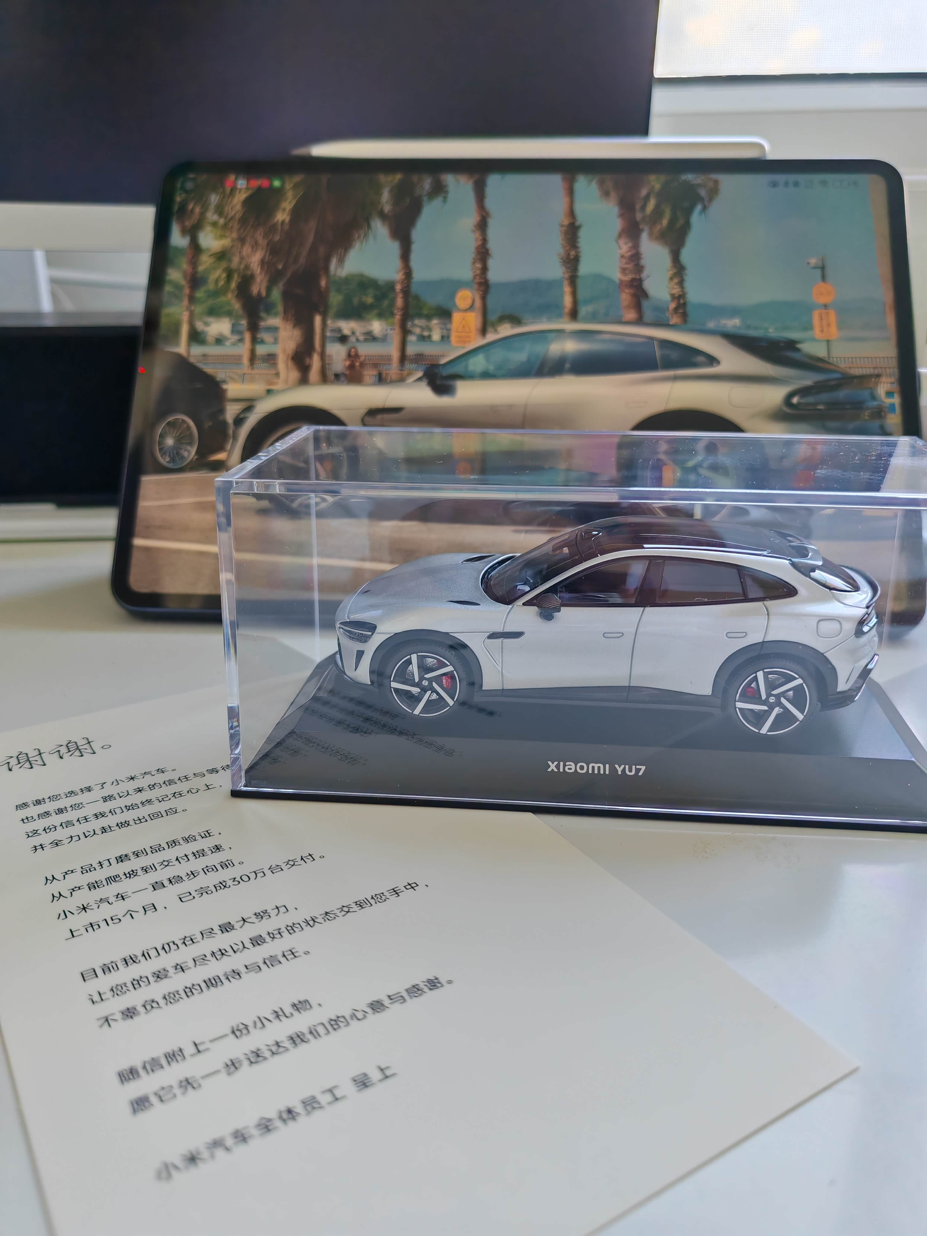 本人和很多男孩子一样,从小就喜欢车,依稀记得6岁的时候就认识四个圈的奥迪,对各种路上的车也能认识大部分。家里面其实有两辆油车开,但是父母也在用车,导致有时候我自己用车就不太方便,其实一直也是需要一辆车的,但也不是刚需,22年的时候还没工作那会儿特别喜欢汉,感觉外观特别帅气,时间来到2324年,华为下场造车,迎来了新一波高峰,电动化过后,造车来到下半场,智能化入场,一个是智能座舱,一个是智能辅助驾驶,当时特别喜欢m7,直到后面出了智界r7,夏天5月份时候其实差点下定,然后夏天呢对车的需求也是很不大,就没买。期间其实一直有关注特斯拉小米,这种行业翘楚以及自身自带特别大流量的车,su7上市时候其实我是特别不看好的,认为月销5000辆就算小米站稳脚跟了(纯电 中大型运动轿车 这个市场在中国就是很难 之前比亚迪海豹,但是经过一年市场验证,雷总真是有两下,证明了车只要外观做的足够帅气,一样可以卖的很好,光有外观也不会成功,让同行真正害怕的是,除了外观像,操控和动力也像。在路上有su7经过总是忍不住要多看两眼,心里已经埋下了一个种子。然后就去试驾su7了,驾驶操控真的爽,家里是有一辆macan,感觉操控和macan旗鼓相当,就是一辆驾驶取向的车。直到6月多份,yu7的各种消息开始放出来,相比于su7,是一款更加成熟的产品,四驱,主副驾双零重力,更大的空间,更好的通过性,甚至有一天晚上还在路上碰到了一辆路试车,实帅!时间来到6月26日,下定yu7,其实当时预算是30左右,家里长途有油车,城市通勤,直接上纯电就可以,yu7完全符合预期