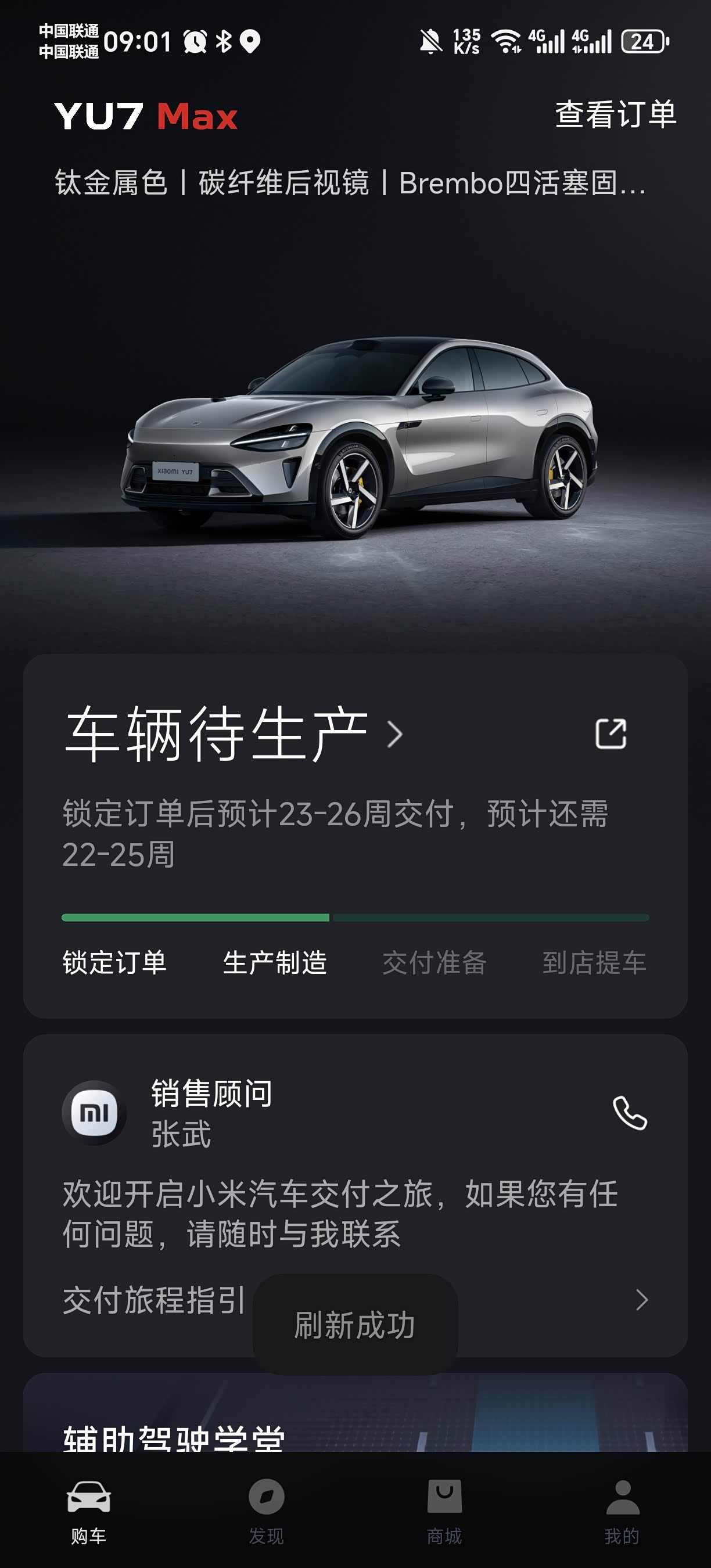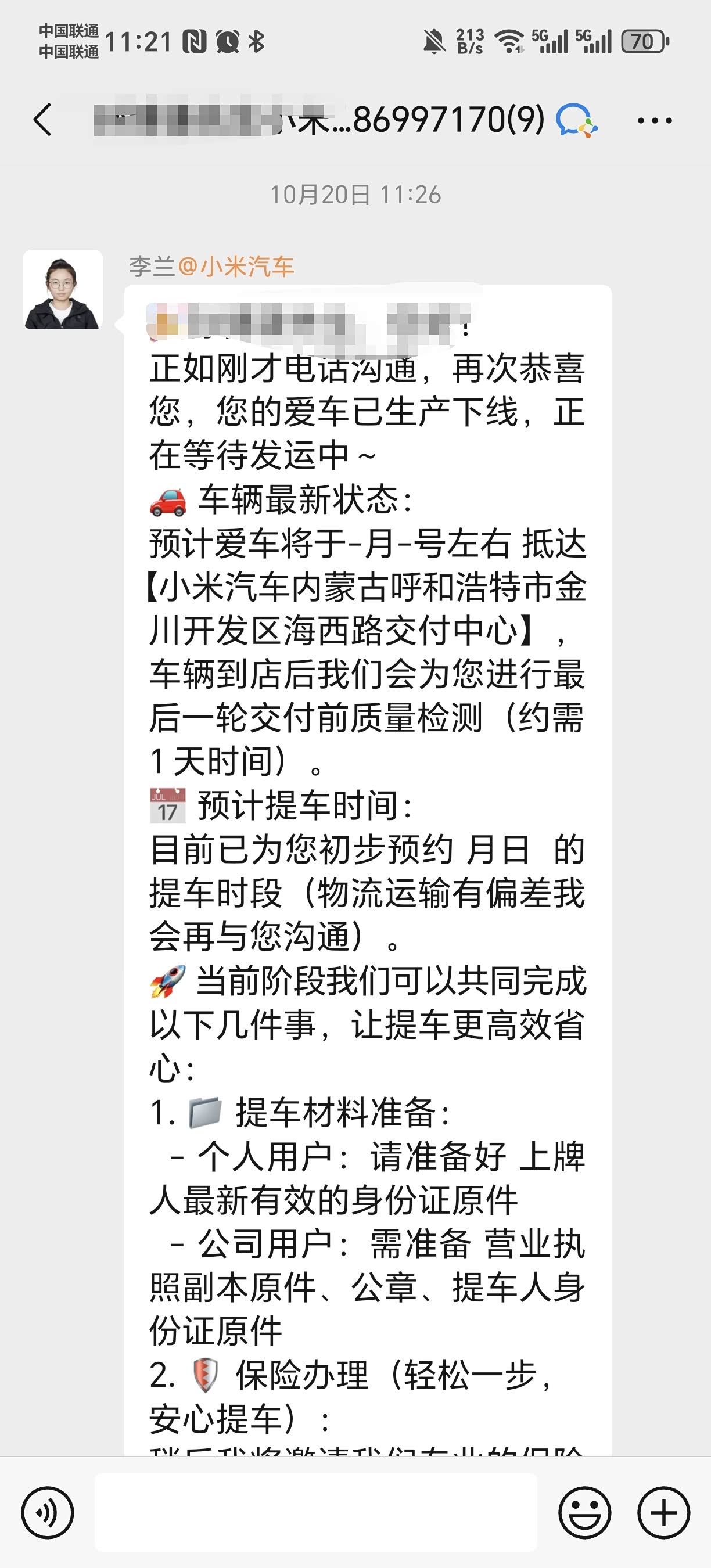 国庆后感觉迎来交付高峰,徐同学上面时间一再提前,最后显示是10月12日哈哈。最终在10月20日中午迎来好消息,车辆已经下线!!!难以言表的开心,等了这么久的大玩具终于要回家了。接着就是约定好在周五10月24日提车。期间在小米app上进行首付贷款操作,工人人员全程非常热心,并且有专业的工作能力。