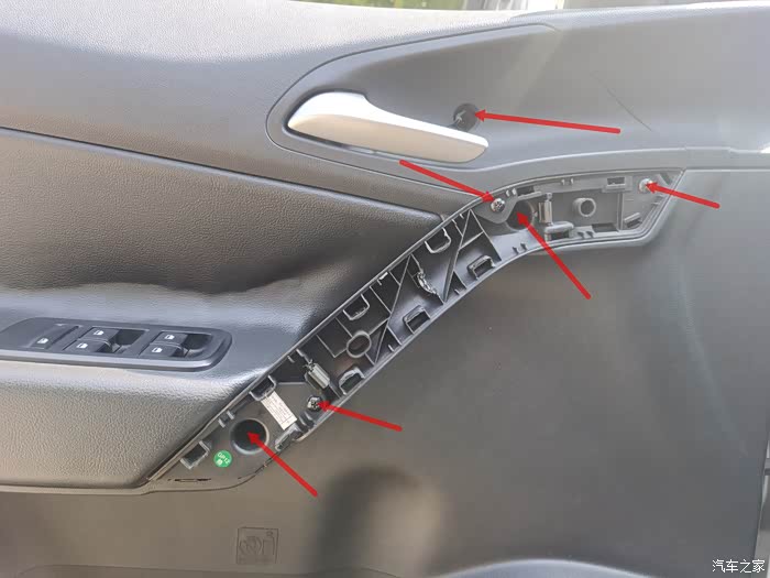 把这些箭头所示的螺丝统统拧下来,至于怎么把内饰拉手盖板拆下来,之前有讲到过,不再赘述,也很简单,自己研究一下