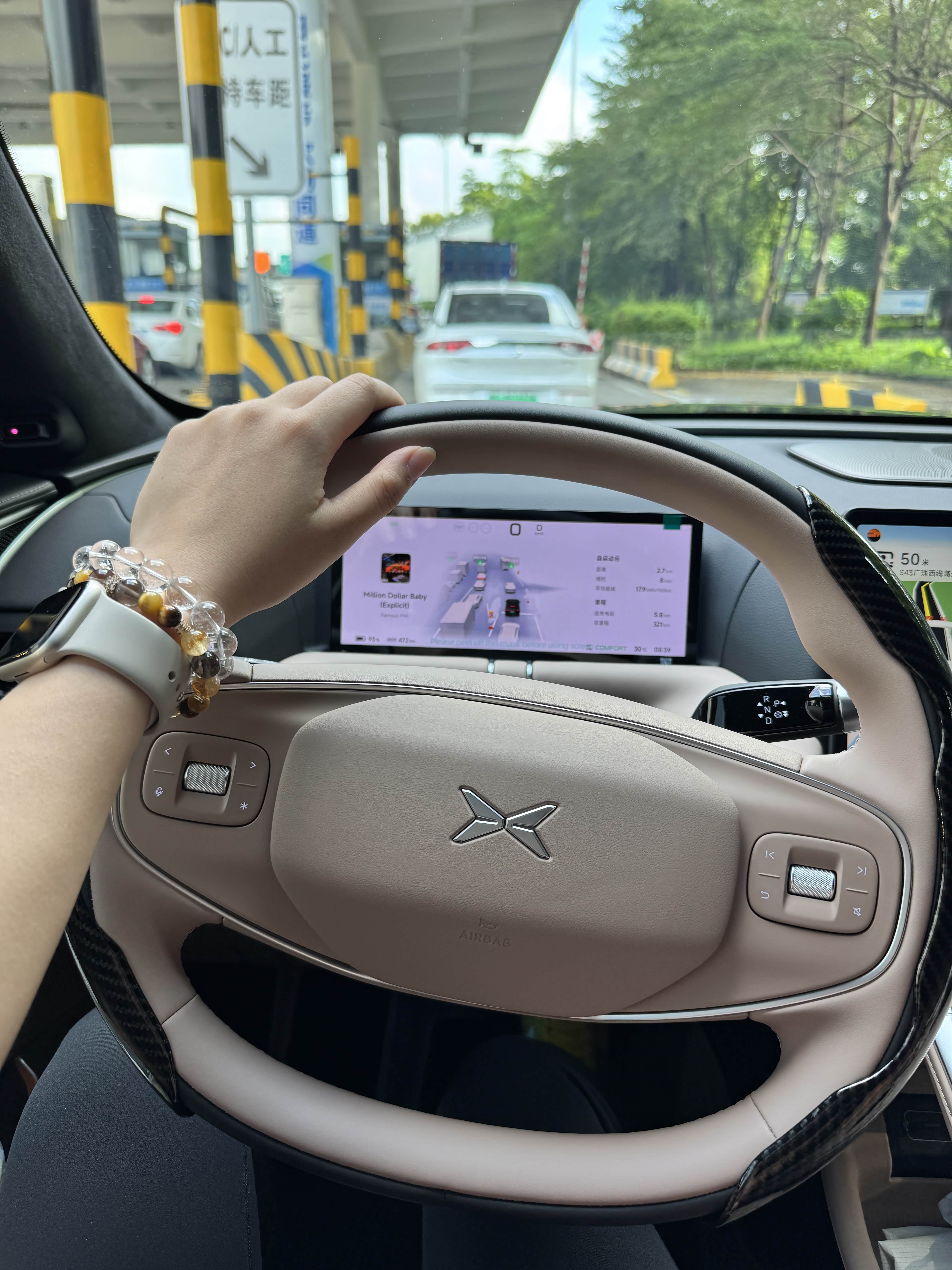 我家那位是个不折不扣的“颜控”+“操控党”,他的Dream Car清单里,永远躺着各种线条流畅、贴地飞行的轿跑。为此我们争执过纠结过。但看到G9的时候我男友也被G9的外观所吸引,它虽然没有那么张扬,但它有一种沉稳的力量感,线条简洁流畅,贯穿式灯带点亮时科技感瞬间拉满。用我男友的话说:“嗯,这车看着挺‘贵’的,不跌面儿。”。我俩都喜欢黑色,果断定了黑武士,内饰怕脏没选白色,爱马仕橙感觉太商务,最终选择了很小众的月影咖(男友还戏称爱车为“黑咖啡”)。提车时候惊艳到我,颜色搭配很好看,皮质质感也很好,爱不释手。