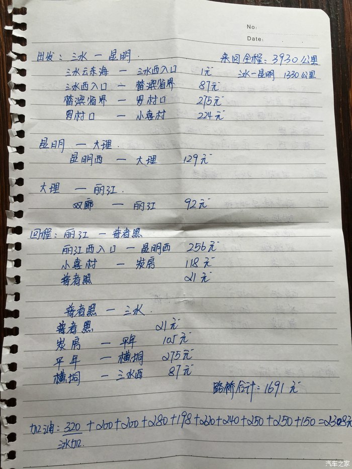 从佛山三水出发的,来回全程3930公里,总共加油2308元,加的油为92与93号汽油,平均油耗0.58元一公里,这里要跟大家说明白,云南那边的油耗都是偏贵的。而且我是全程高速都基本140-150时速飞奔的,而且云南的爬山 比较多,而且高原地方,这样的油耗我还是非常满意的!