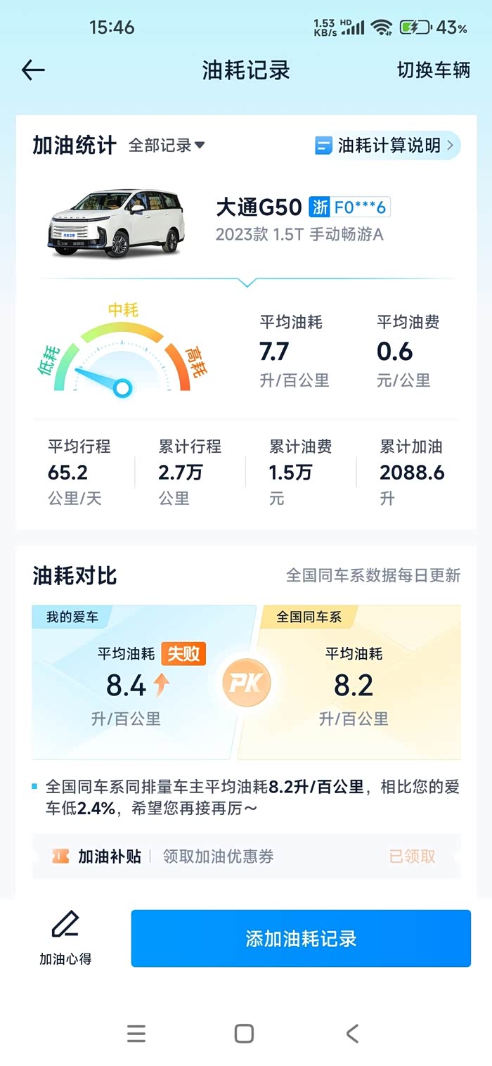 我的7.8,没想到这么省油,跟我的面包车油耗一样。