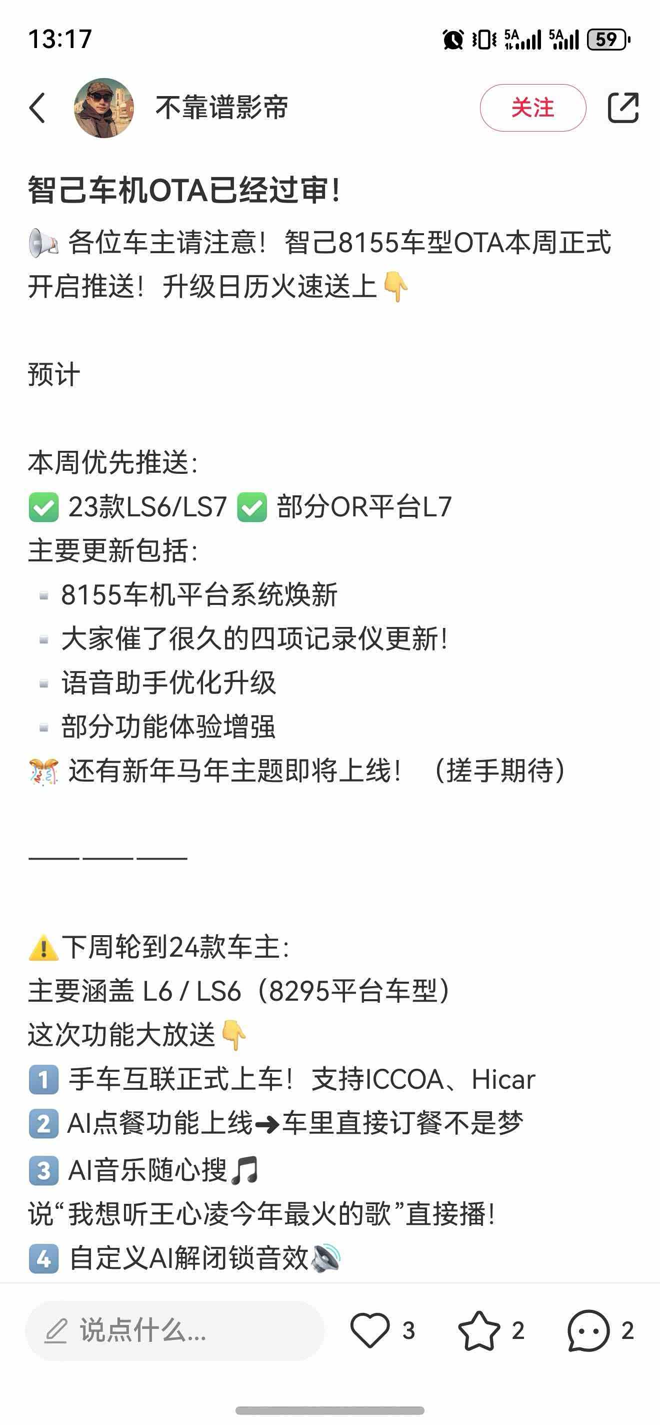 我们老款8295下周要更新新座舱了,多了解闭锁自定义音效,还多了安卓机的车手互联,可以不用,但是不能没有。另外期待年后im ad r6大模型早点上啊,越来越怕自己开车了,觉得麻烦。