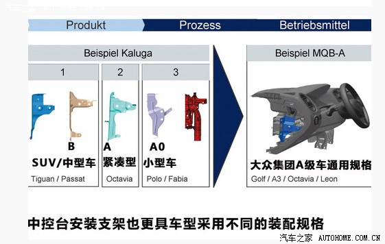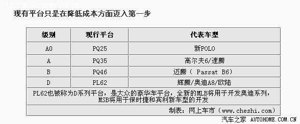 大众集团对自己的平台都有严格的划分,而且适合不同车型的平台也系列化发展,有的已经有几代了。例如A0级的PQ25上一代成为PQ24,全新的平台拉大了尺寸而且轻量化方面更具优势。PQ46作为大众B级车最新的平台,使用了全新的前横置设计,一改上代的纵置设计。但是这些平台在同级别车型中实现了共用,但是在制造上面还不能做到,平台在生产线上就根据不同级别车型变大或者变小。所以全新的模块化就是针对这个问题提出的课题,产物就是一系列的MQB。从最小的Polo到Passat都可以模块化共线制造。
