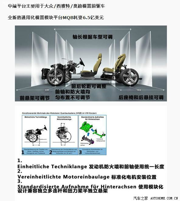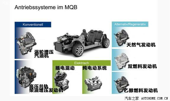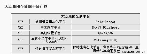 大众集团2月1日在德国沃尔夫斯堡发布了全新研发的横置发动机模块化平台 MQB(Modular Querbaukasten)。该平台主要作为中型车到小心使用(A0-B级车)将在大众集团旗下的大众、奥迪、斯柯达和西雅特品牌中得到极为广泛的应用(横置前驱车型),衍生出不同的新车,从小型车Polo到中型车帕萨特。