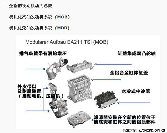 全新的模块化发动机,是MQB平台的重要组成。涵盖了当今所有的发动机动力类型。EA211 汽油发动机的马力输出介于60匹 (40 kW)到150匹 (110 kW)之间,将采用ACT可变排量技术,从而成为全球首款拥有这类技术的四缸发动机。代号EA288的全新柴油发动机的峰值马力输出介于90匹 (66 kW)到190匹 (140 kW)之间,所以我们更关注全新的EA211引入国内。