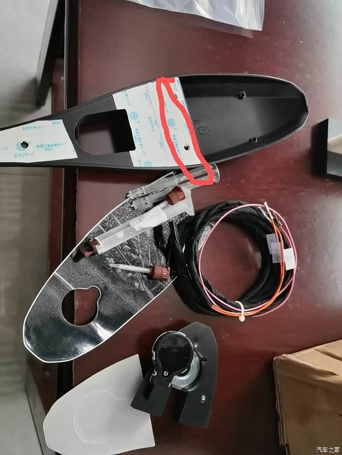 然后把线束穿进去,拧好三颗螺丝,撕掉双面胶,接线直接卡后视镜底座上黏住