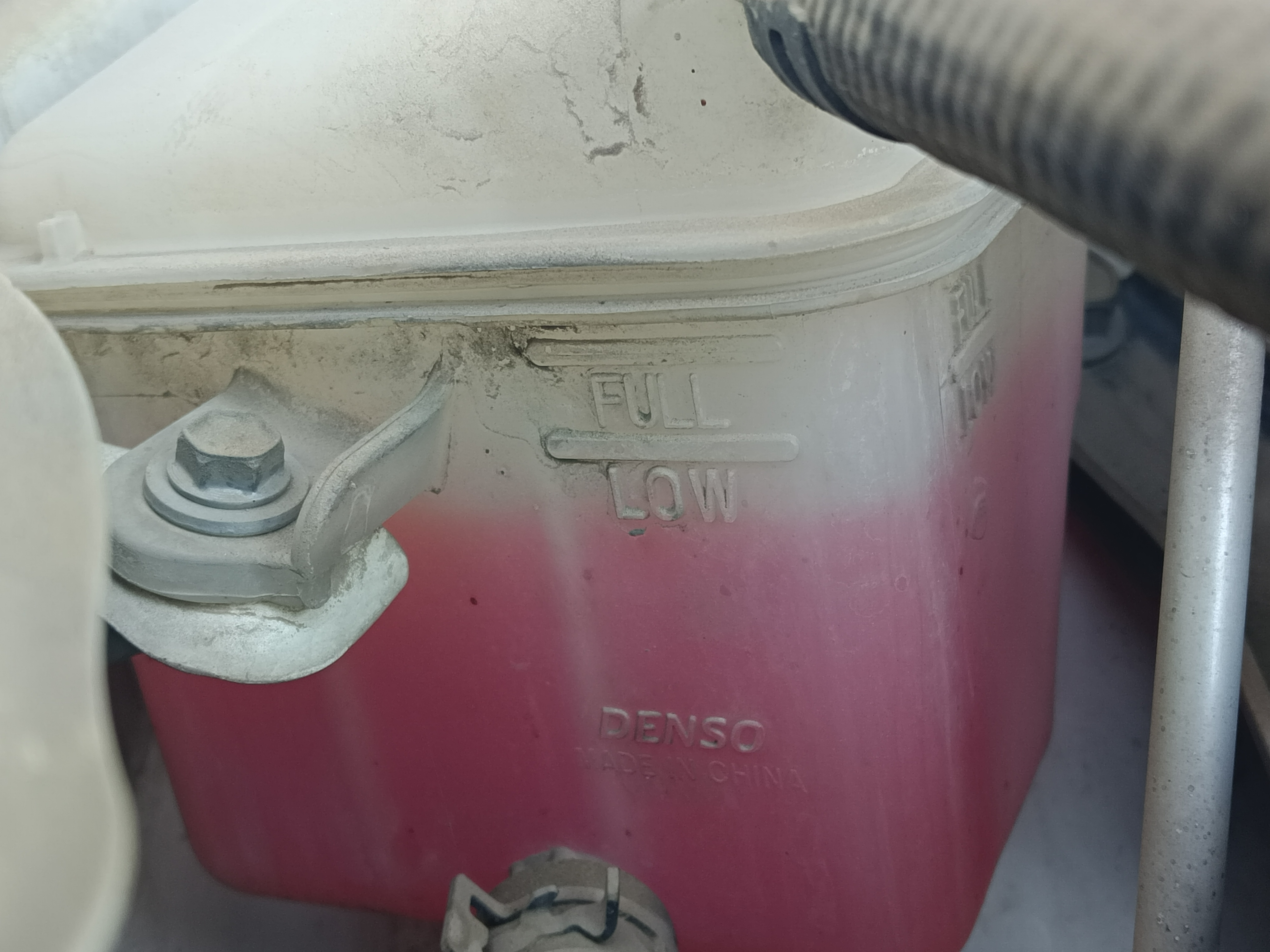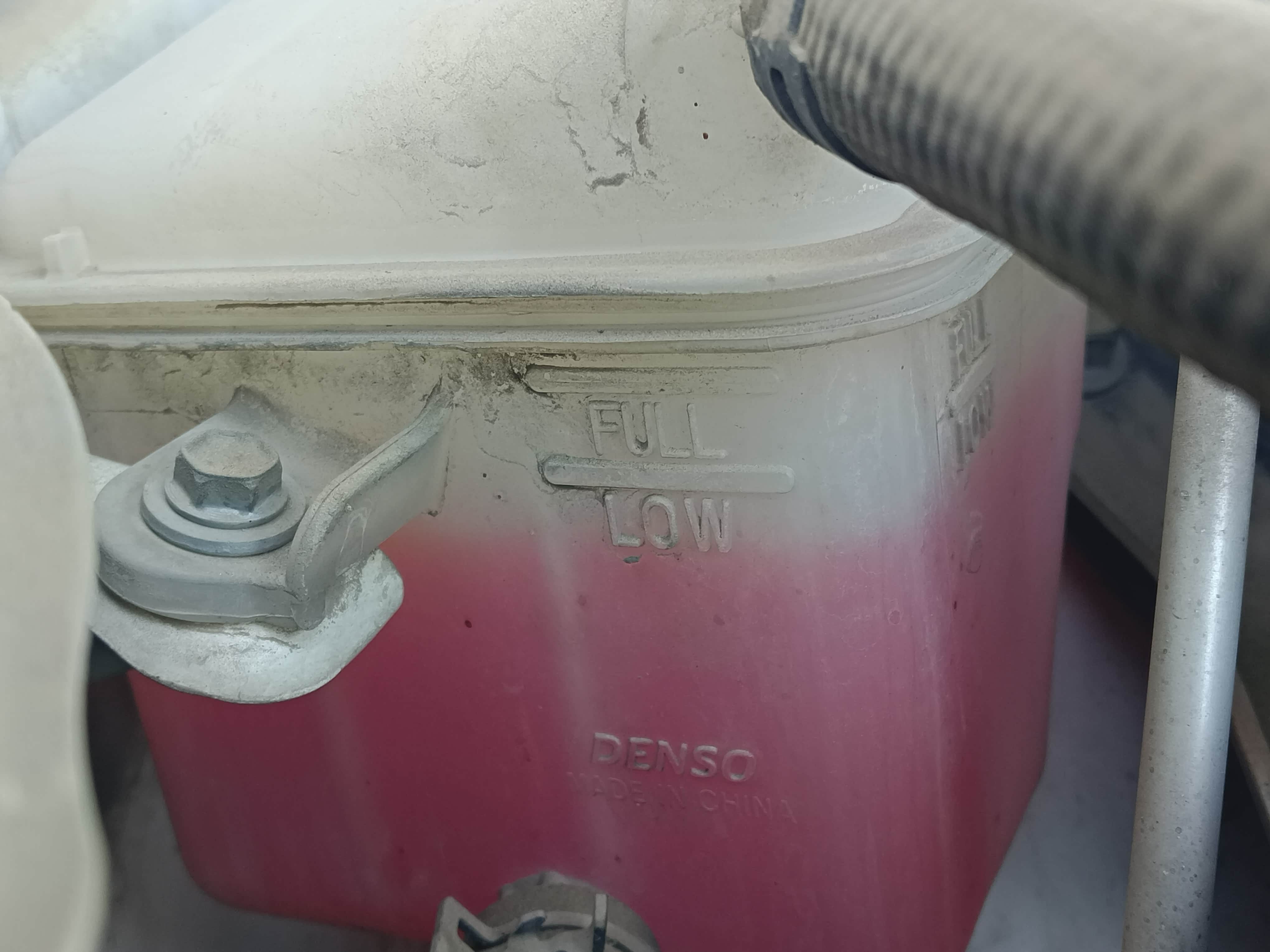 这个回水壶标示的最高和最低标记,图片上来看确实低于最低标记了。假如手上正好有同品牌的防冻液,及时添加肯定是最好的;要是手上没有,那就打开回水壶盖子,看一下内部上回水管管口插在什么高度,管口要是还淹没在防冻液下面,那么回水是没有问题的,短时间内可以不用添加,要是回水管口已经漏出或者即将漏出液面,那么就需要及时添加了,避免冷却系统里面进入空气,造成冷却液循环不良。